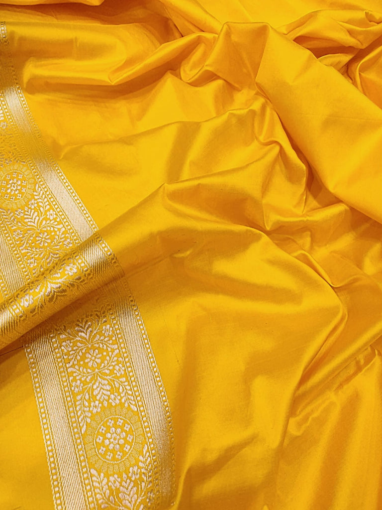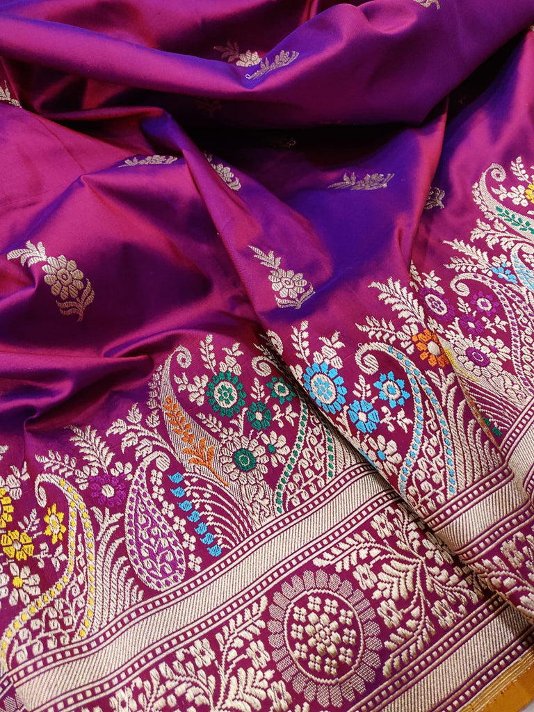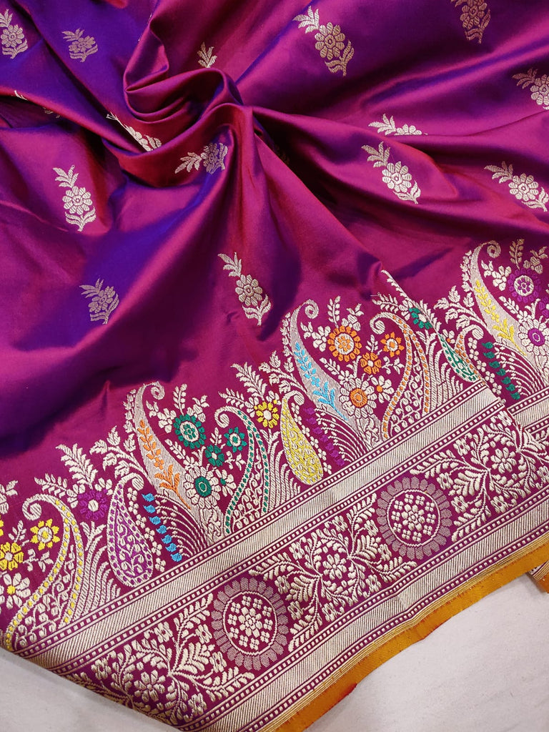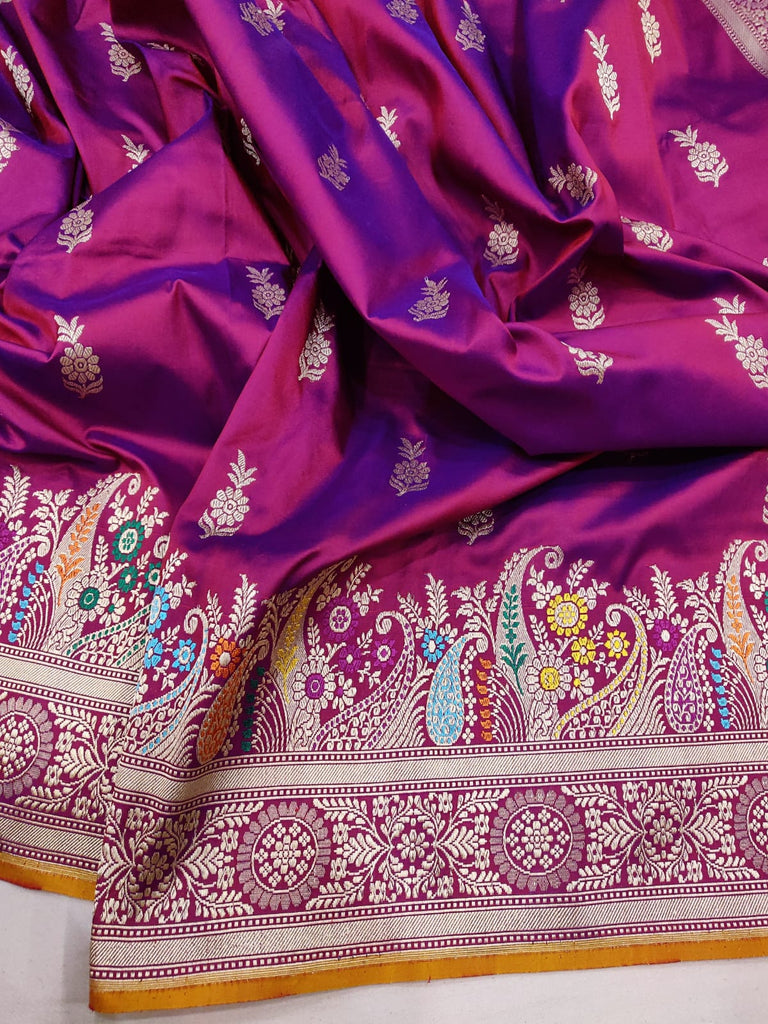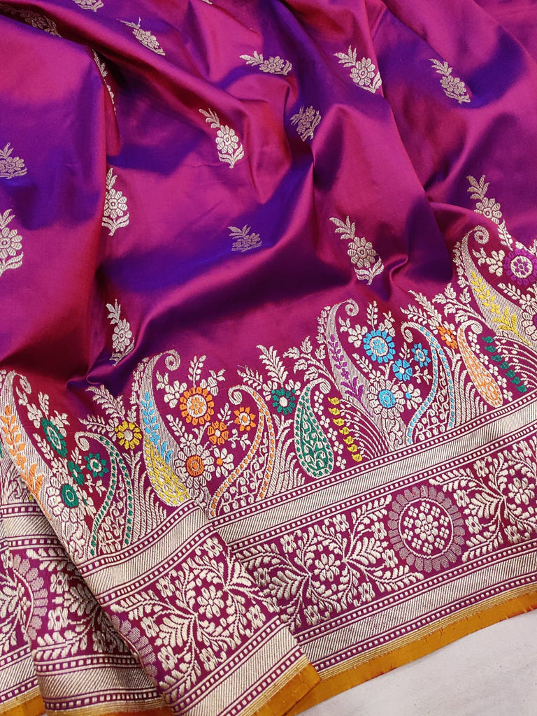 Pure katan silk Handwoven fully kadwa All over silver and gold zari booties with designer multicolor resham meenakari border and contrast piping weaved very much exclusive piece of Banarasi saree