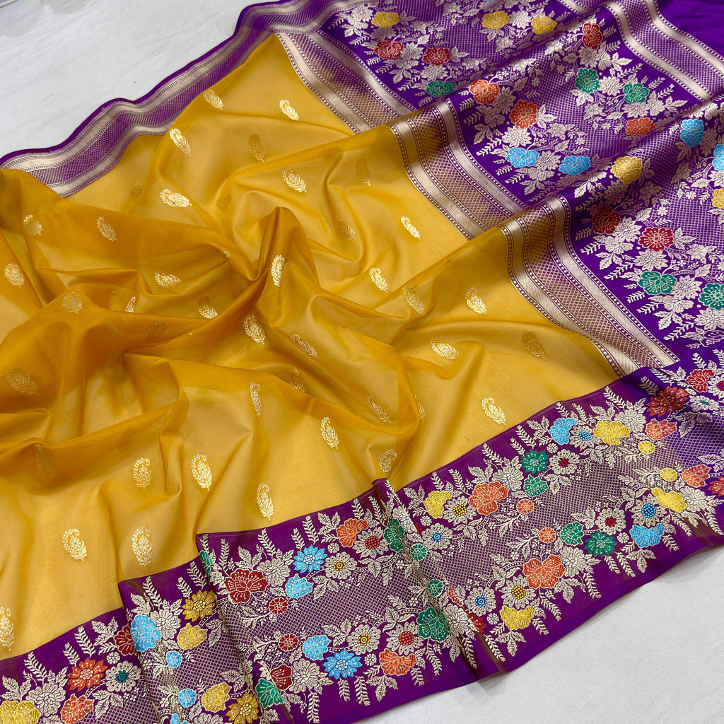Pure kora handwoven all over fully kadwa gold zari booties with desginer multicolour resham meenakari and gold zari contrast skirt border and designer pallu weave very much exclusive piece of Banarasi saree