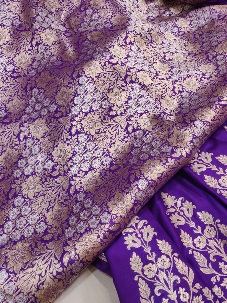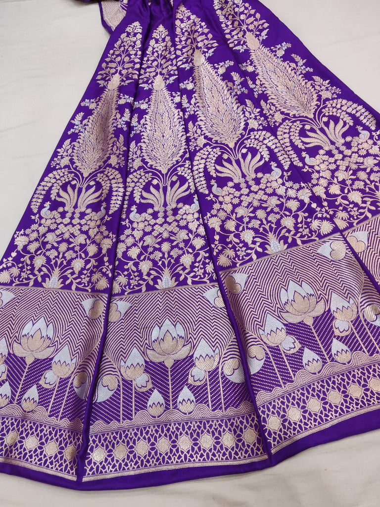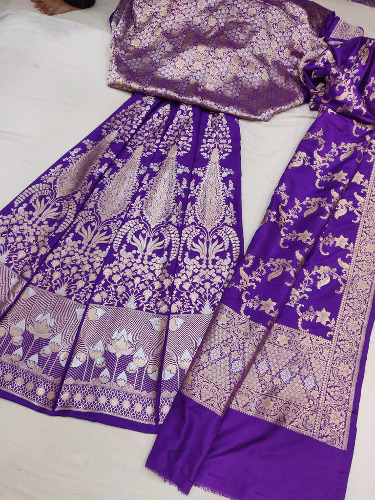 Pure katan silk Handwoven all over silver and gold zari motifs weave very much exclusive piece of Banarasi lehnga, blouse and dupatta.