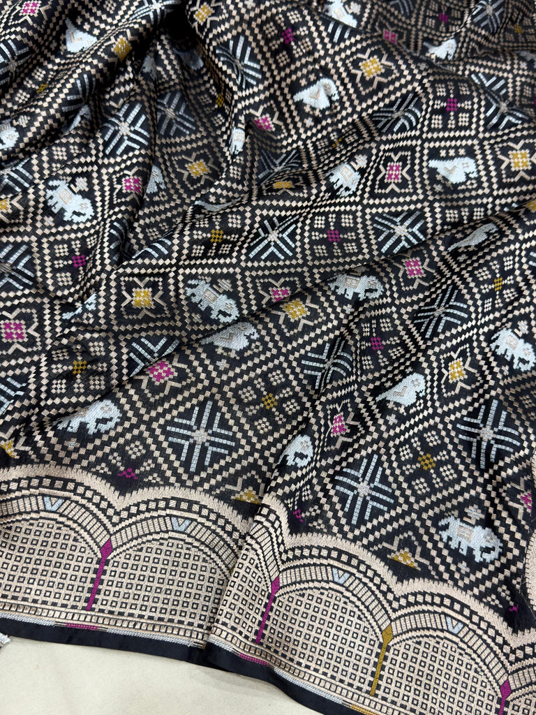 Pure katan silk Handwoven all over silver ,gold zari and designer multicolour resham meenakari pathan motifs on base with gold zari and multicolor resham meenakari rich border and pallu weave very much exclusive piece of pathan patola Banarasi saree