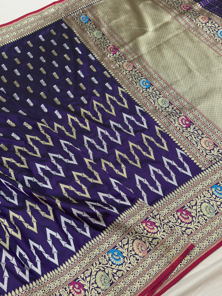 Pure katan silk handwoven fully kadhwa, all over the body(bottom part has zigzag & uper part booties) has silver and gold zari designer motifs with gold zari and multicolour Resham meenakari alfi border and rich zari weave pallu, very much exclusive piece of banarasi saree