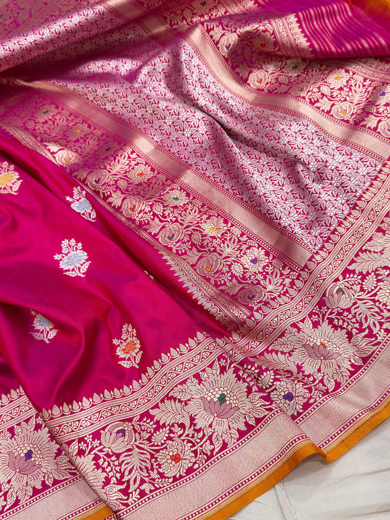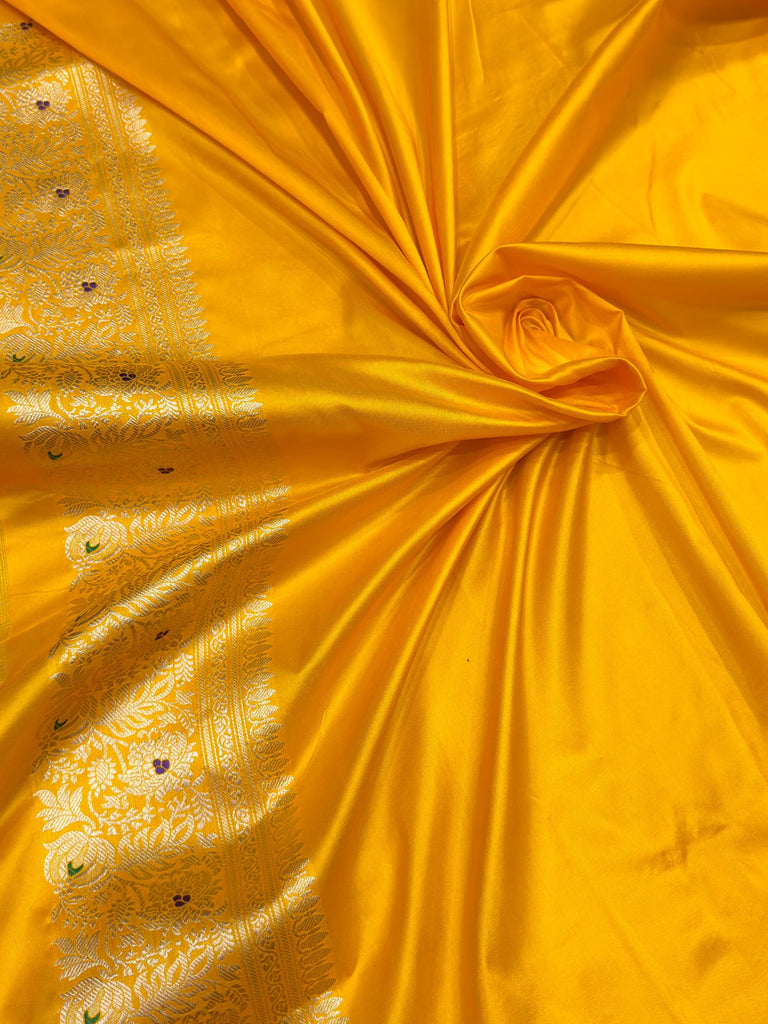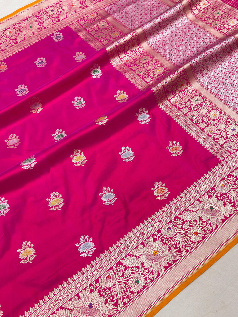 Pure katan silk handwoven fully kadwa all over gold zari and multicolour resham meenakari alfi bootas and gold zari with meenakari, designer rich border and pallu weave very much exclusive piece of Banarasi Saree