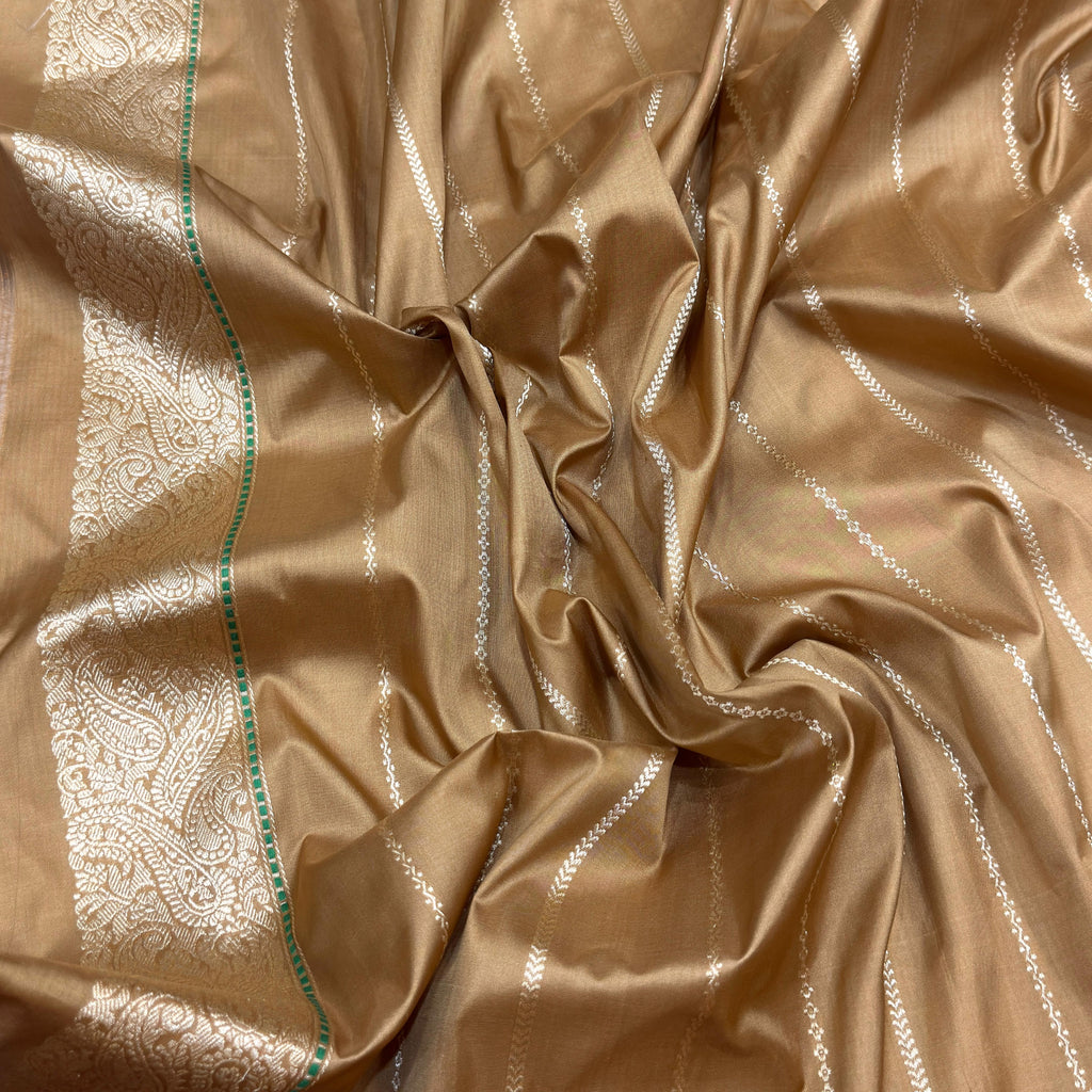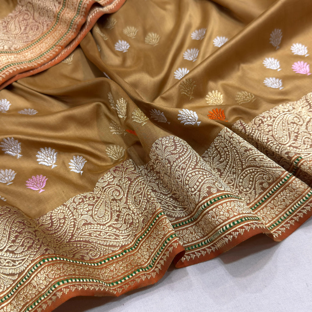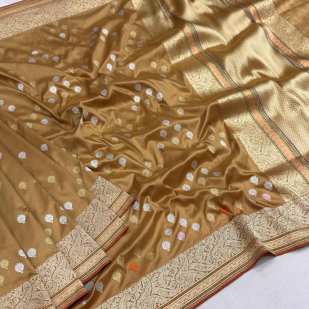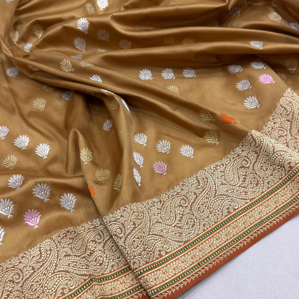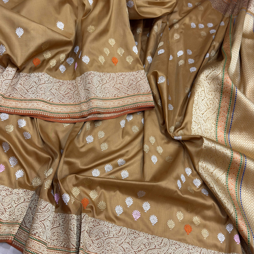 Pure katan silk Handwoven fully kadhwa all over silver and gold zari booties in zigzag style on sholder part and rest body part has silver and gold zari booties in a row with designer silver, gold and multicolour resham meenakari booties in zigzag style on skirt patran, border and pallu has rich gold zari weave very much exclusive piece of designer Banarasi saree