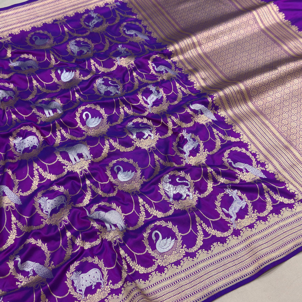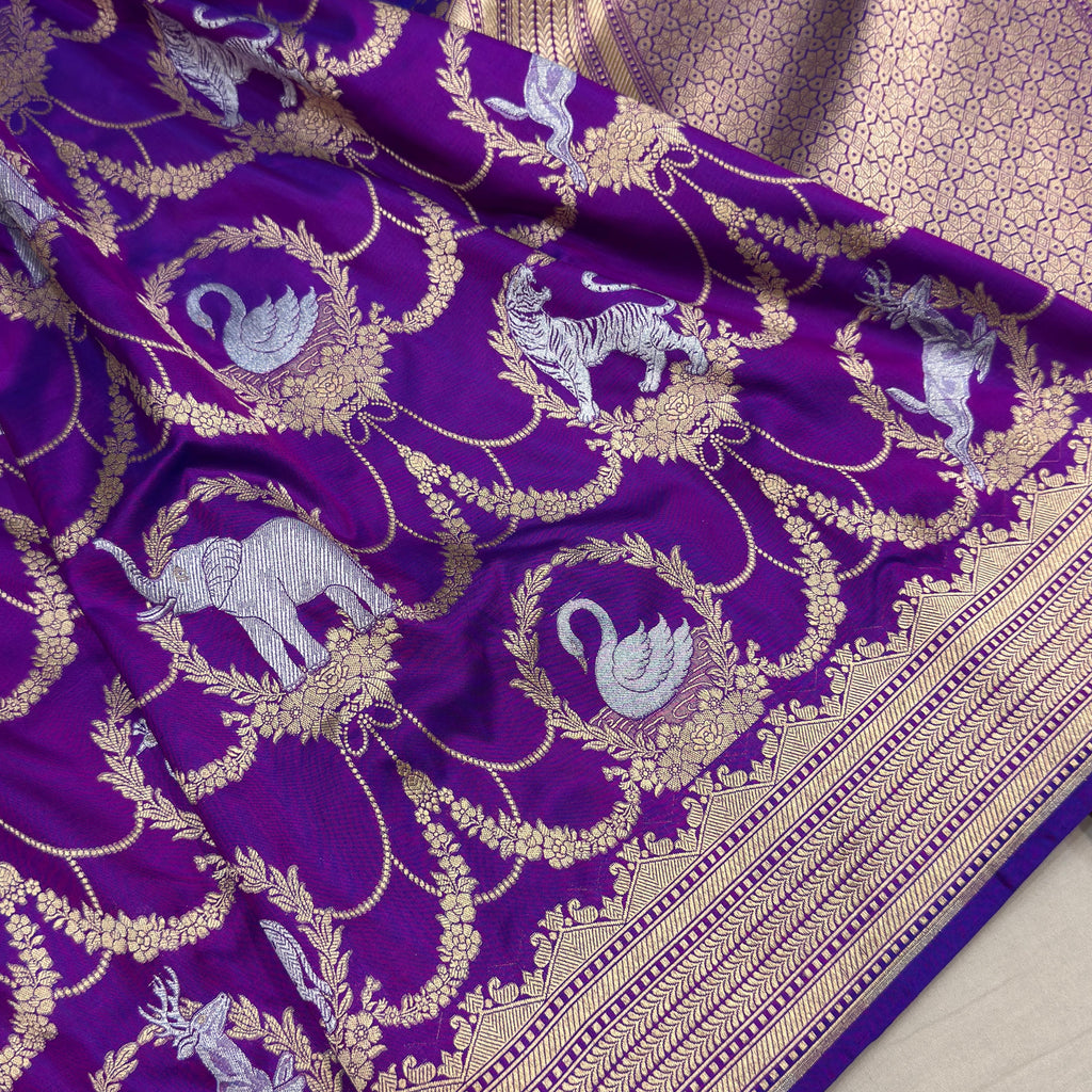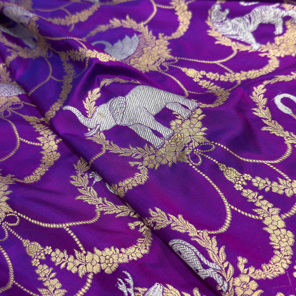 Pure katan silk Handwoven all over gold zari designer jaal and silver zari animals motifs with gold zari rich border and pallu weave very much exclusive piece of Banarasi saree