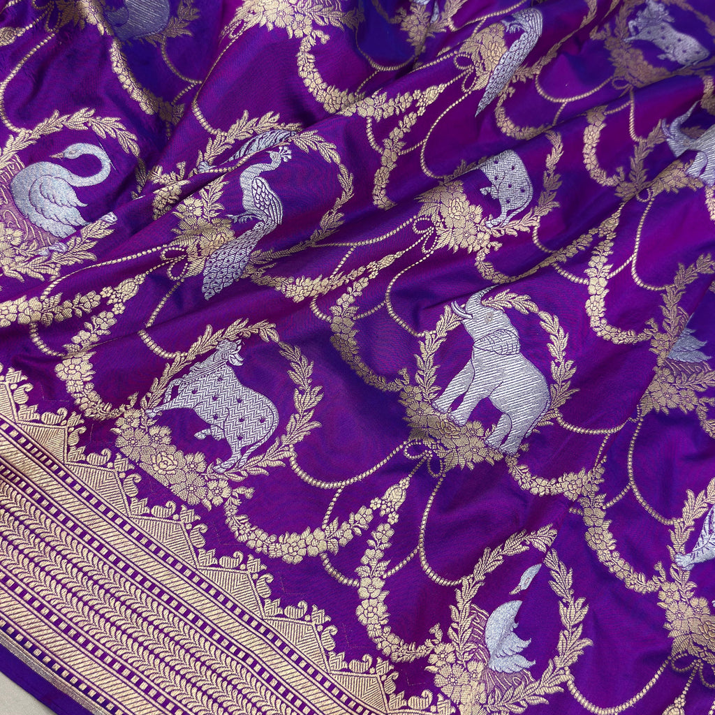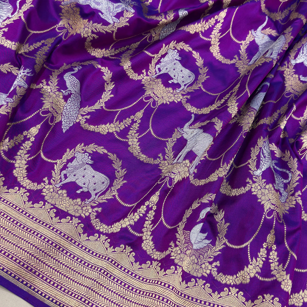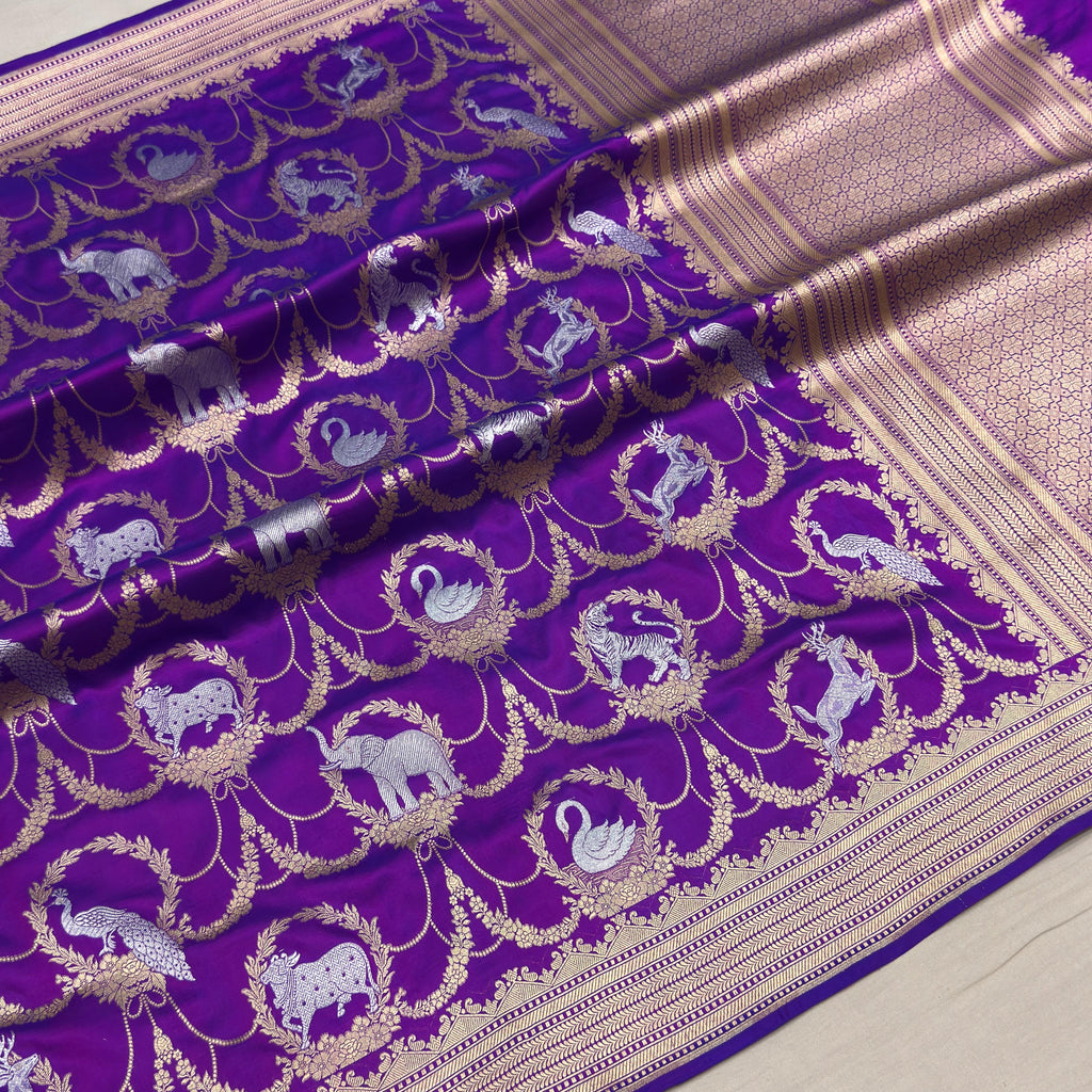 Pure katan silk Handwoven all over gold zari designer jaal and silver zari animals motifs with gold zari rich border and pallu weave very much exclusive piece of Banarasi saree