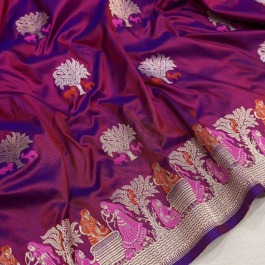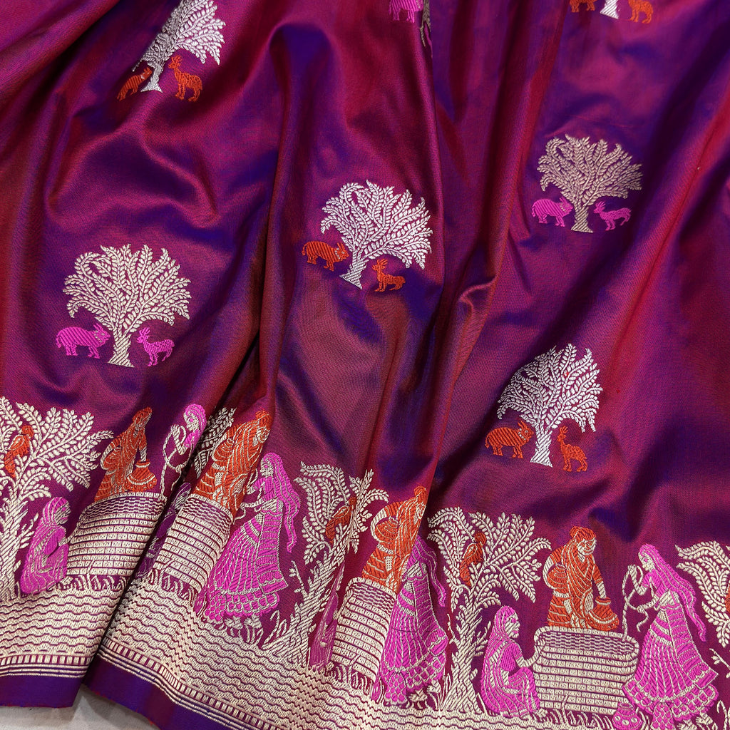 Pure katan silk Handwoven fully kadwa all over silver ,gold zari tree and resham meenakari animal motifs on base with both side(upper and lower border) gold zari and 2 color resham meenakari, alfi figure motifs weave very much exclusive piece of Banarasi saree