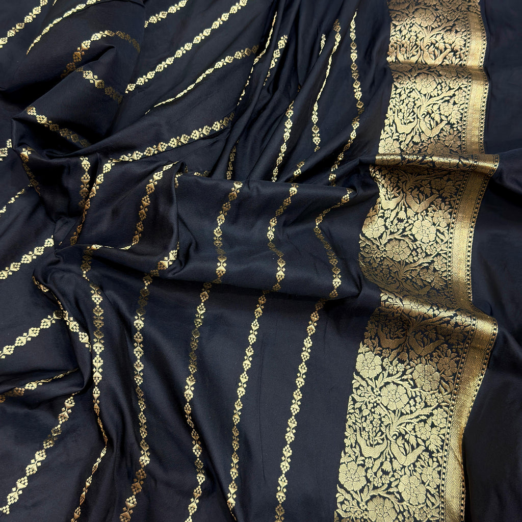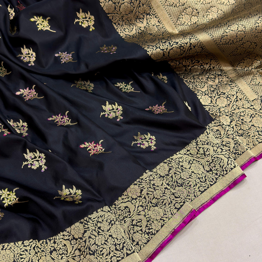 Pure ektara katan silk handwoven fully kadwa all over gold zari and multicolour resham meenakari alfi bootas with gold zari rich border, contrast piping and pallu weave very much exclusive piece of banarasi saree