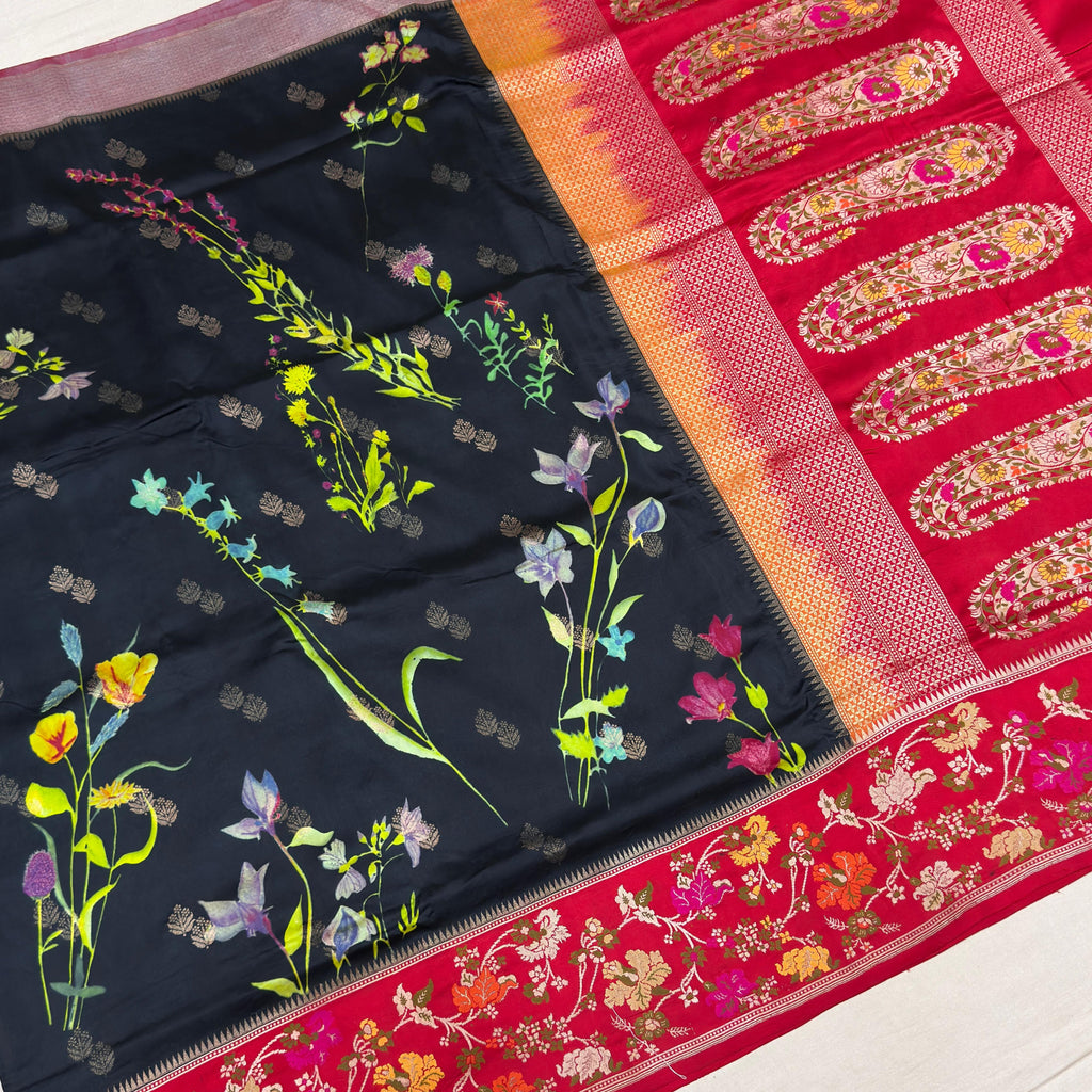 Pure katan silk handwoven all over gold and antique gold zari booties with multicolor digital floral print on base and multicolour resham meenakari kadhiyal contrast border and designer paisley pallu weave very much exclusive piece of banarasi saree.