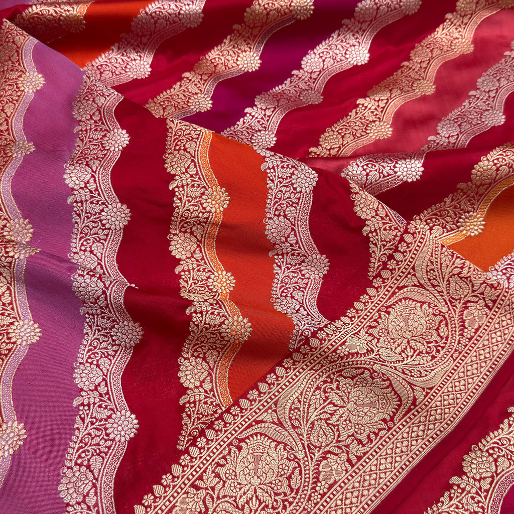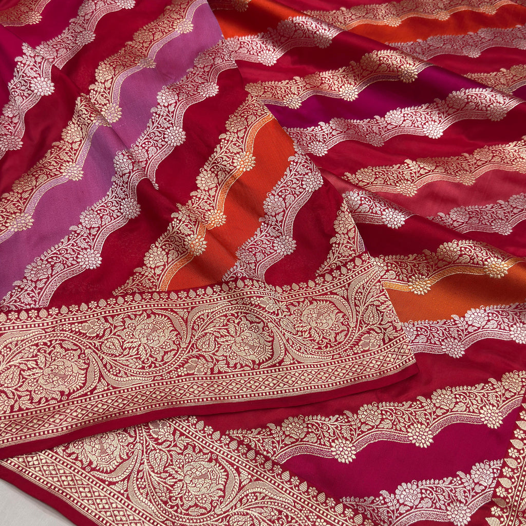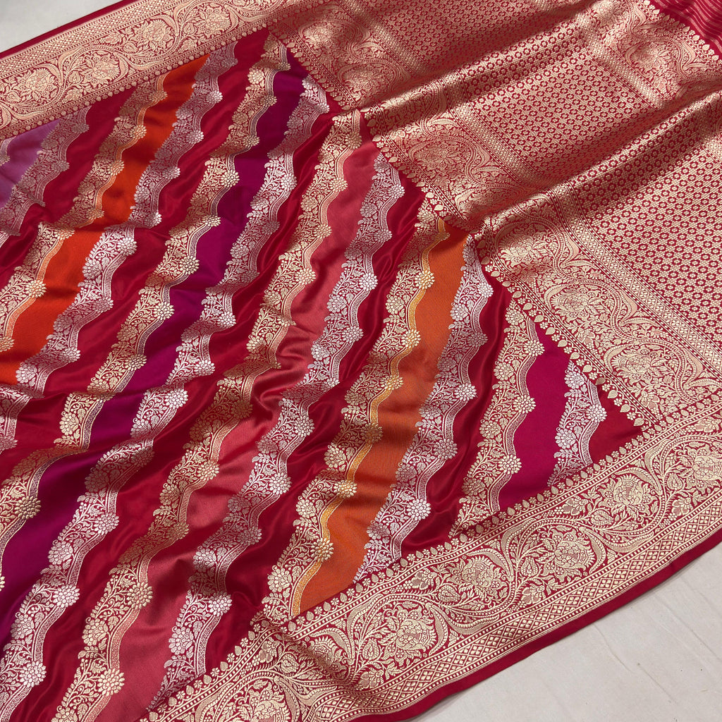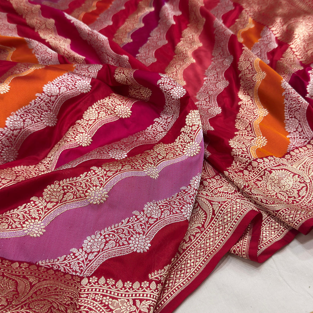 Pure katan silk Handwoven fully kadwa all over silver, gold zari ada motifs on multicolor rangkat base with designer gold zari rich border and pallu weave very much exclusive piece of Banarasi saree