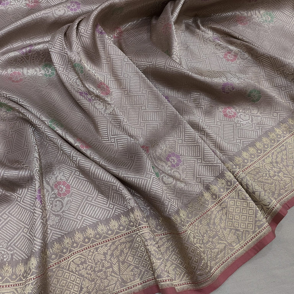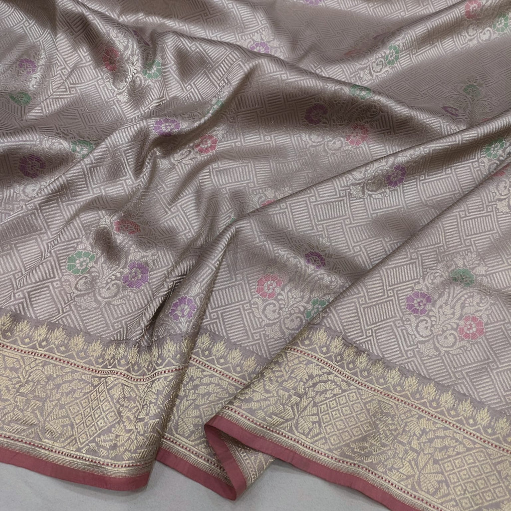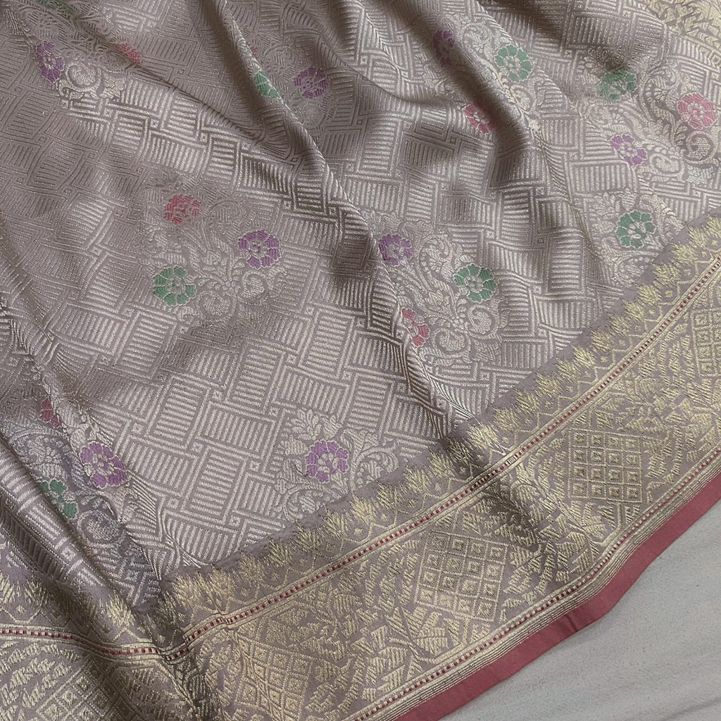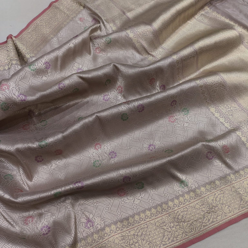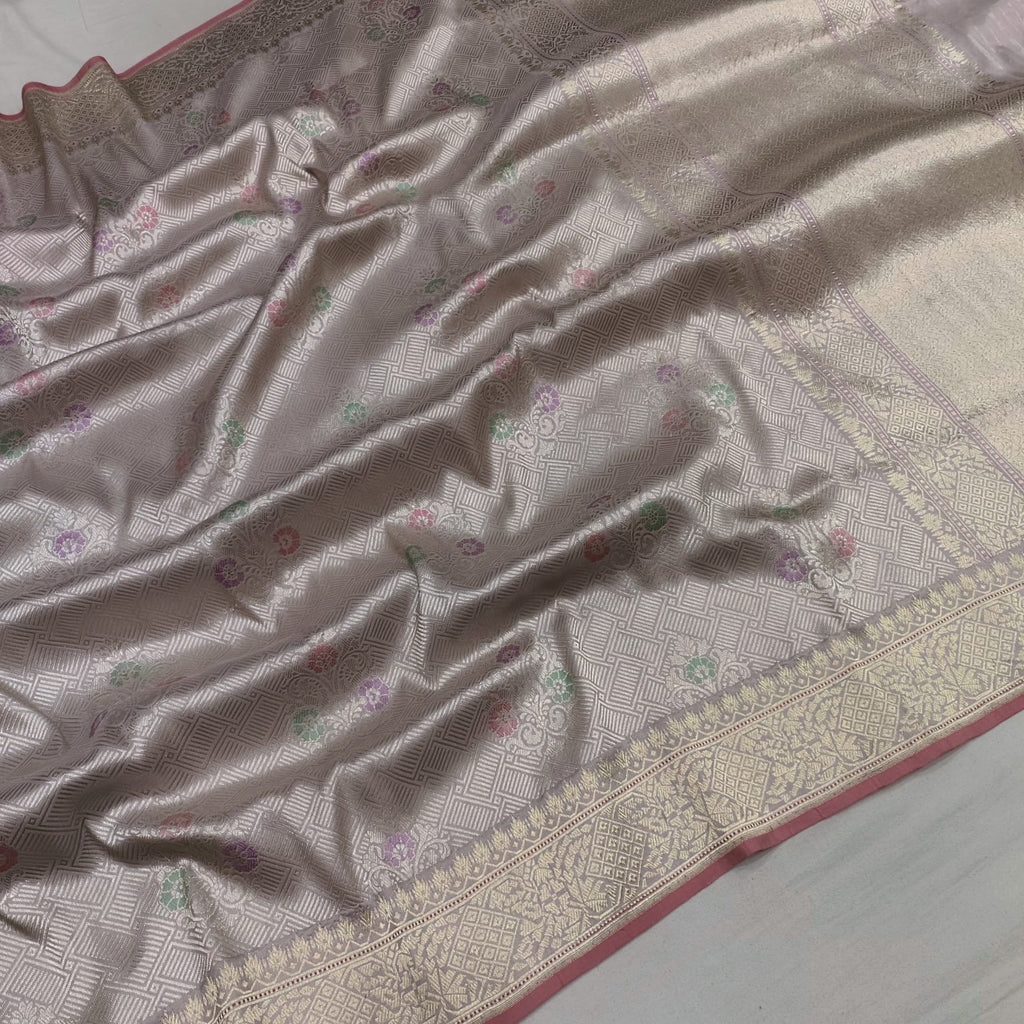 Pure katan silk Handwoven All over light gold zari tanchoi motifs and multicolor resham meenakari base with gold zari rich border & seded contrast piping weave very much exclusive piece of Banarasi saree