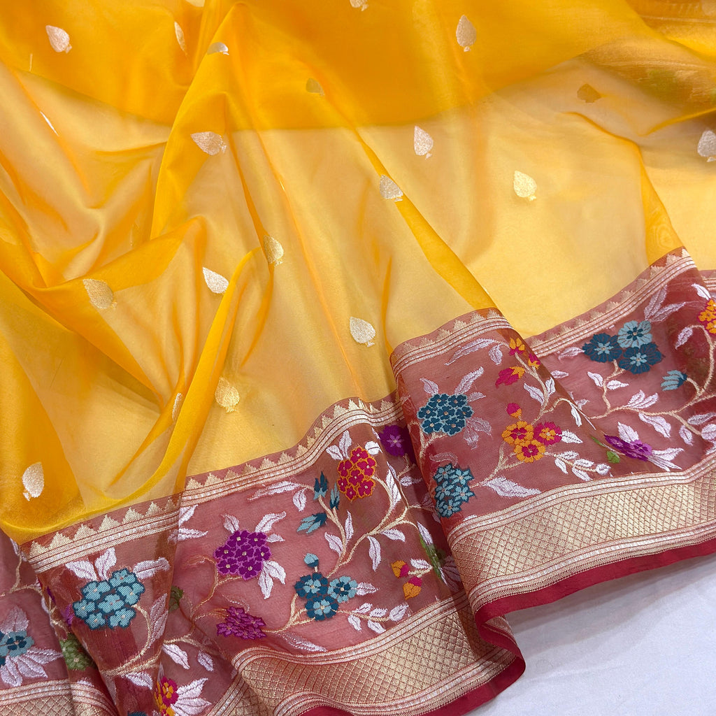 Pure kora Handwoven all over silver and gold zari booties with designer multicolor resham meenakari border weave very much exclusive piece of Banarasi saree