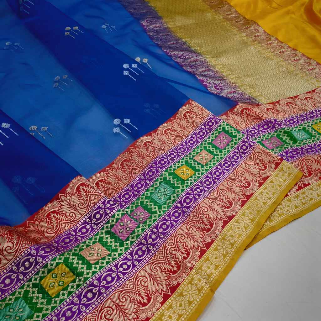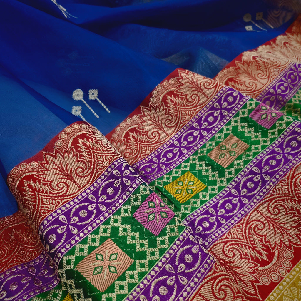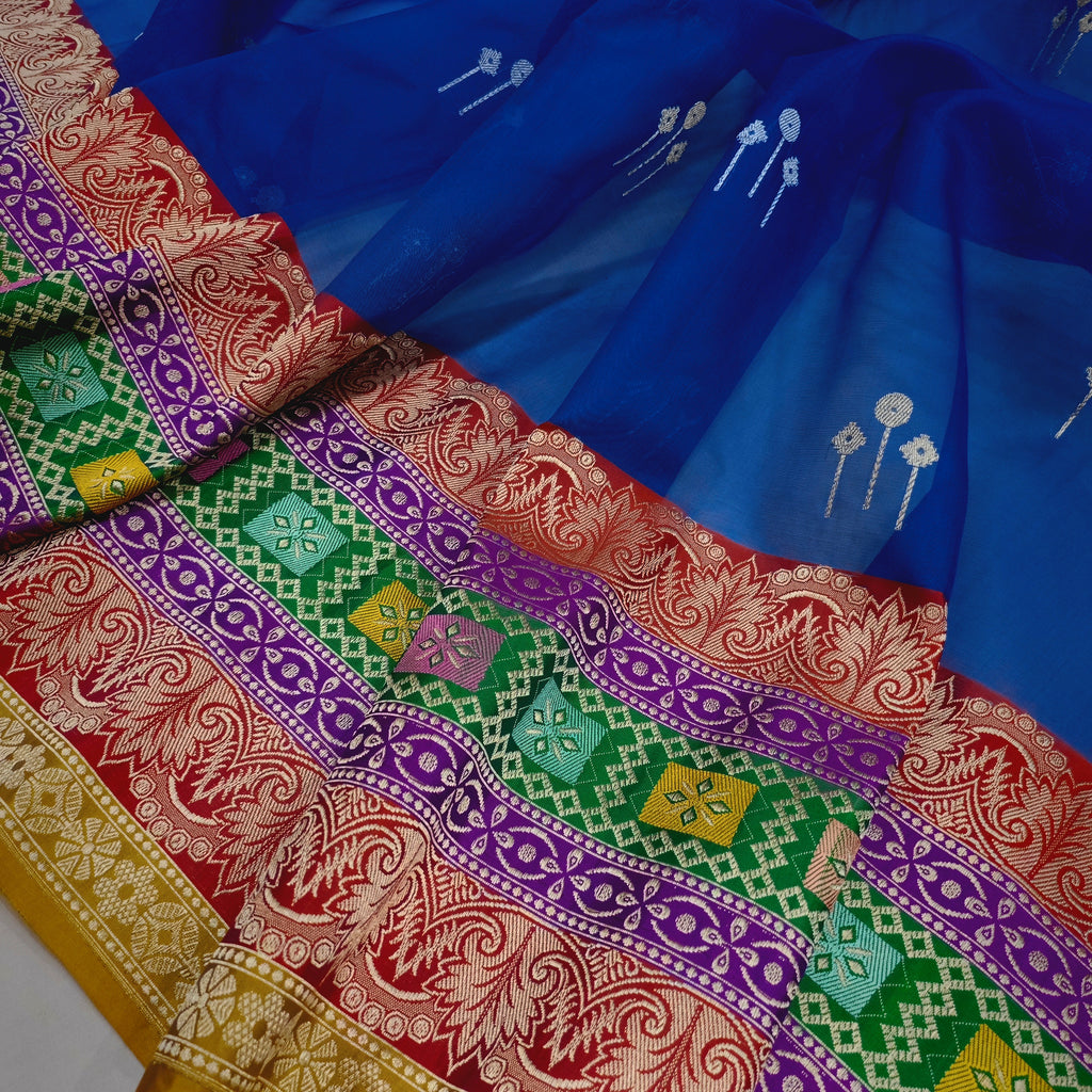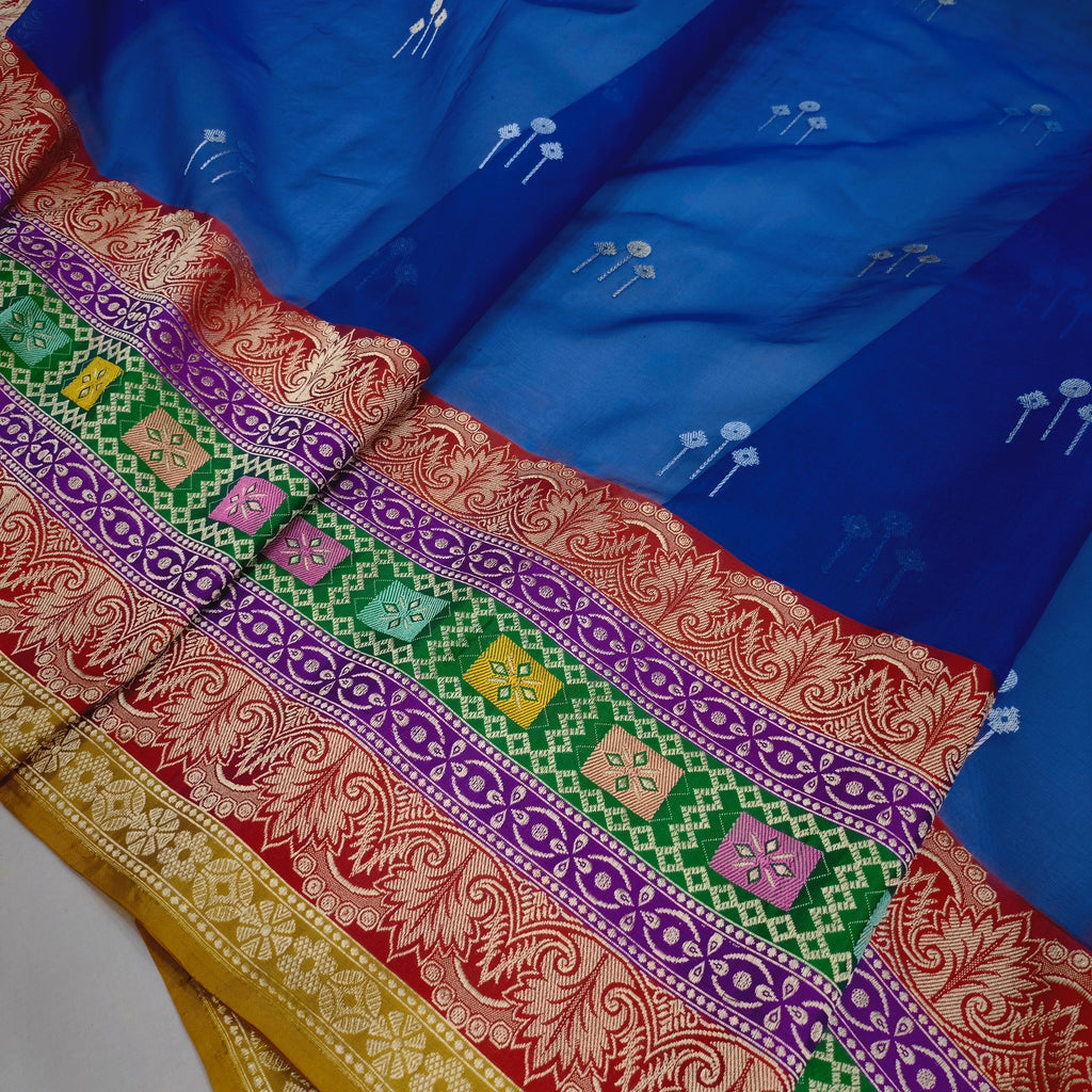 Pure kora Handwoven fully kadwa All over multicolour resham meenakari booties with designer gold zari and multicolour rangkat border , rich pallu weave very much exclusive piece of Banarasi saree