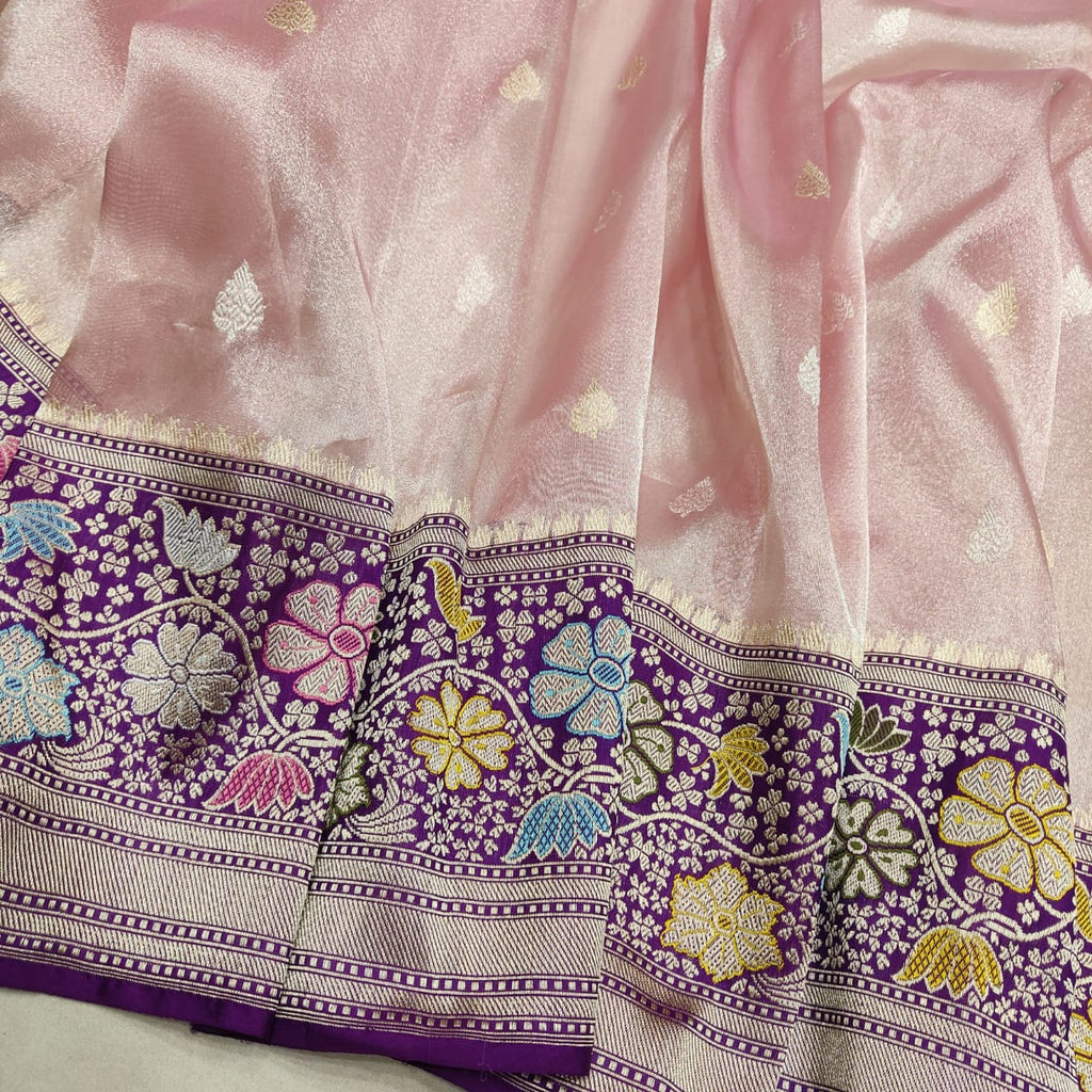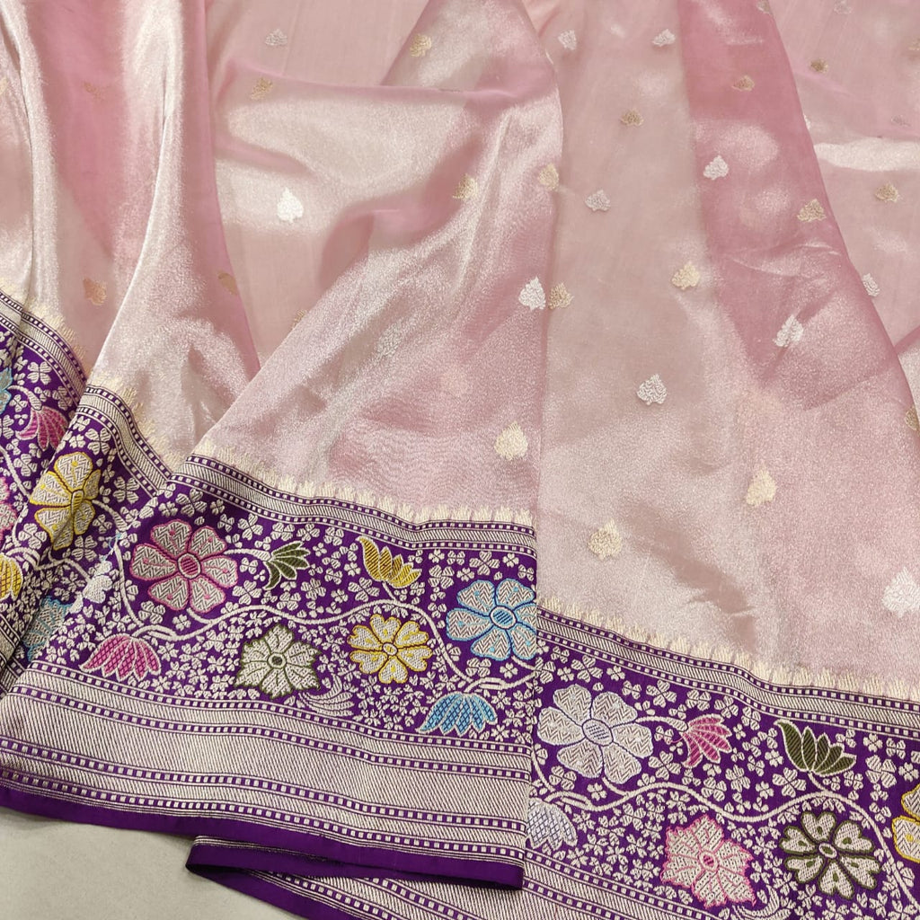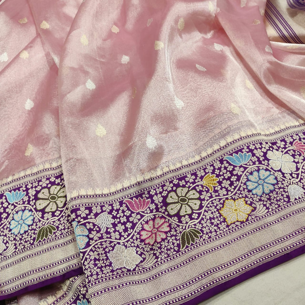 Pure tissue silk Handwoven fully kadwa All over silver and gold zari booties with designer multicolor resham meenakari kadhiyal border and pallu weave very much exclusive piece of Banarasi saree