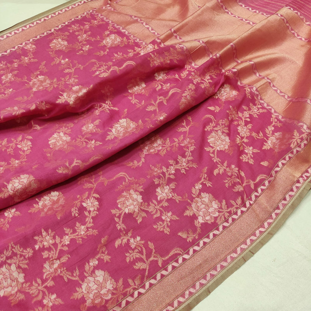 Pure cotton handwoven all over silver and gold zari designer jaal motifs with silver, gold zari Rich border and pallu weave very much exclusive piece of Banarasi saree