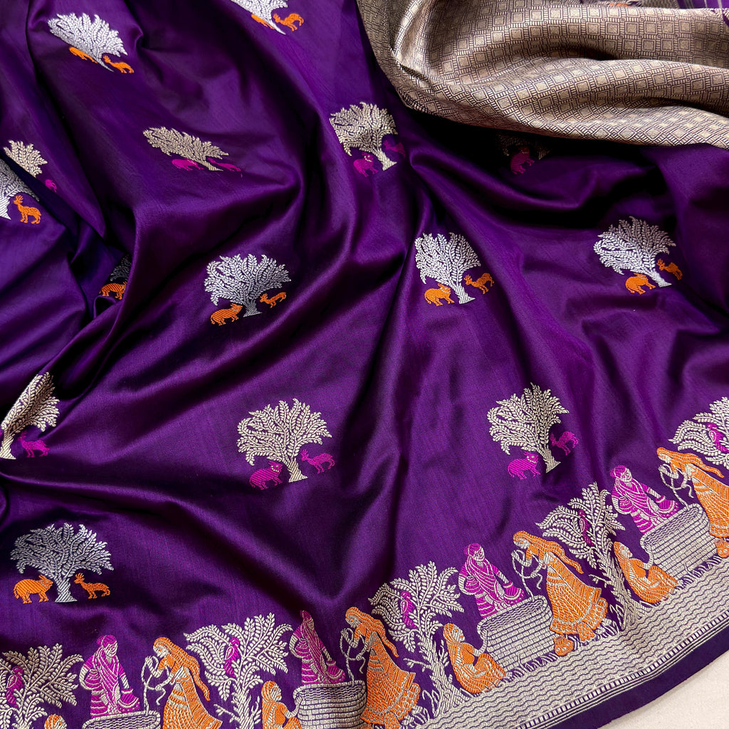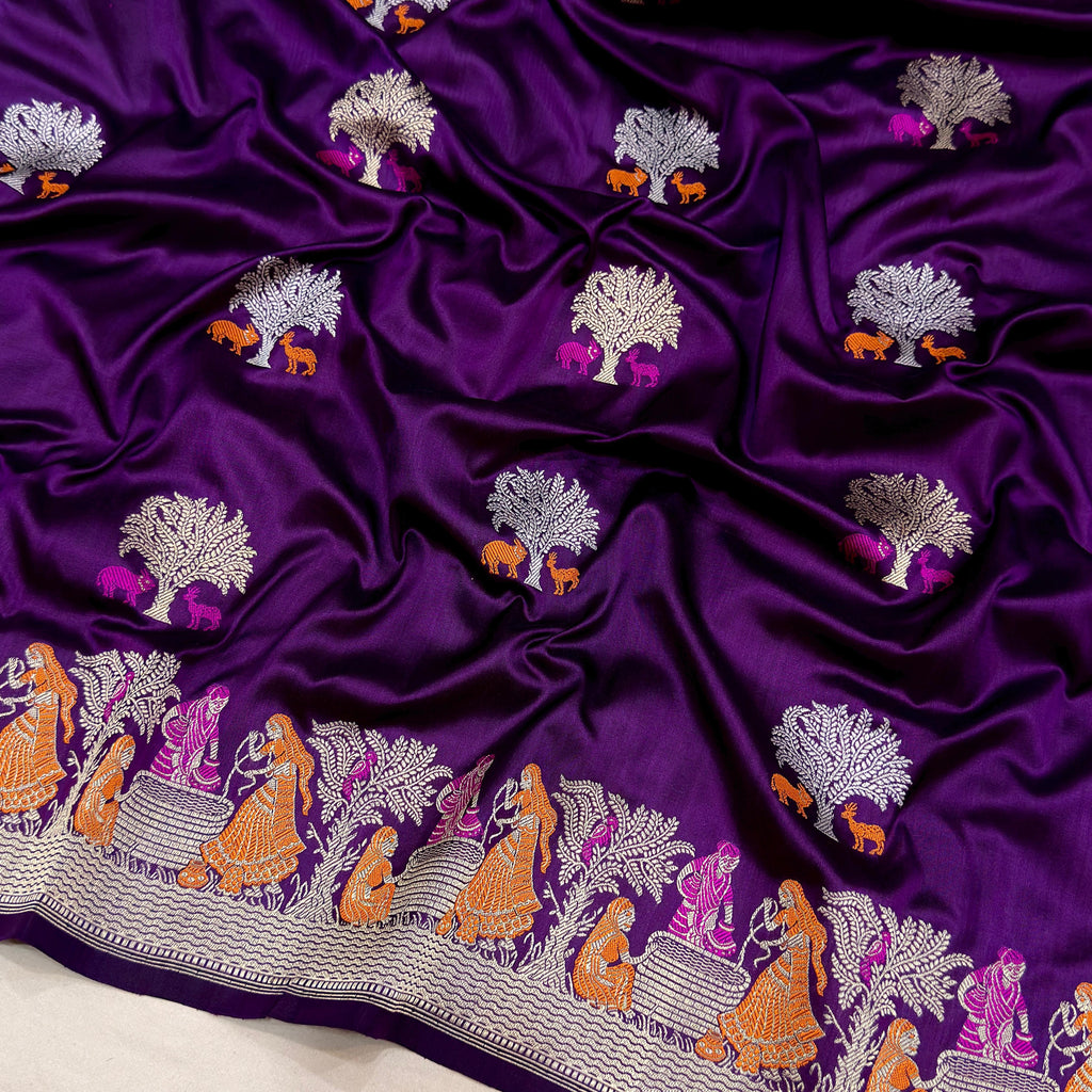 Pure katan silk Handwoven fully kadwa all over gold zari tree and resham meenakari animal motifs on base with both side(upper and lower border) gold zari and 2 color resham meenakari, alfi figure motifs weave very much exclusive piece of Banarasi saree
