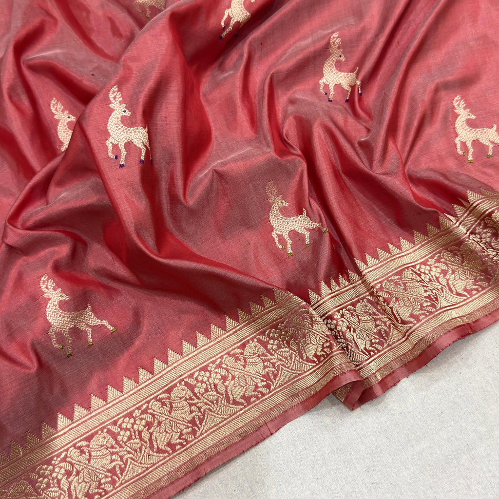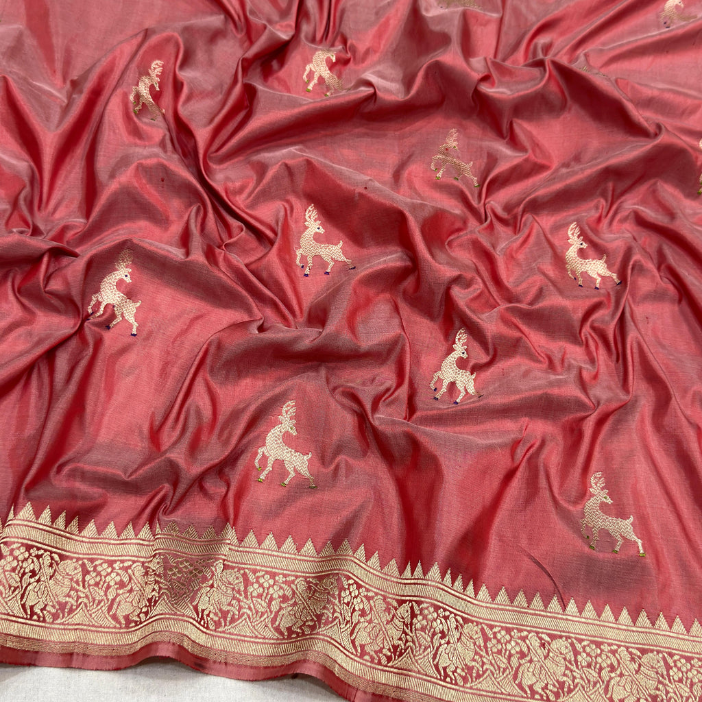 Pure katan silk Handwoven all over gold zari and two colours resham meenakari deer motifs with gold zari rich shikargah border and pallu weave very much exclusive piece of Banarasi saree