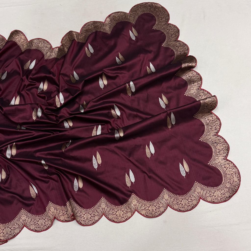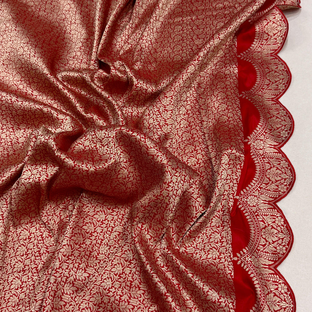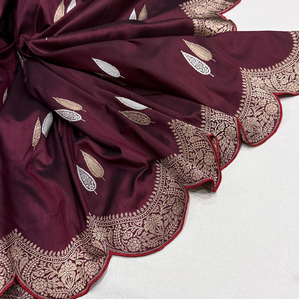 Pure katan silk handwoven fully kadwa all over silver and gold zari booties with designer gold zari scallop border, pallu and contrast piping weave very much exclusive piece of banarasi saree