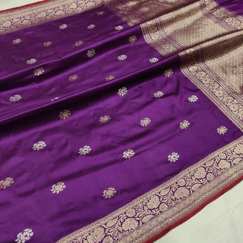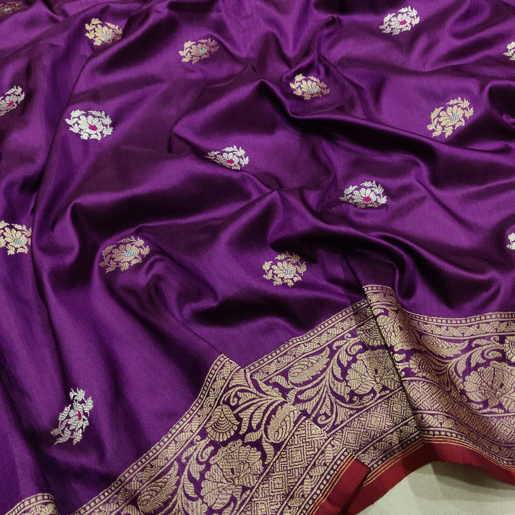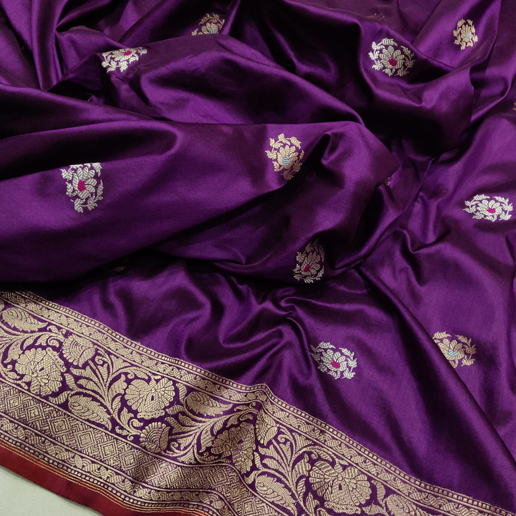 Pure katan silk Handwoven fully kadwa All over silver, gold zari and multicolor resham meenakari alfi booties with designer gold zari rich border and pallu weave very much exclusive piece of Banarasi saree