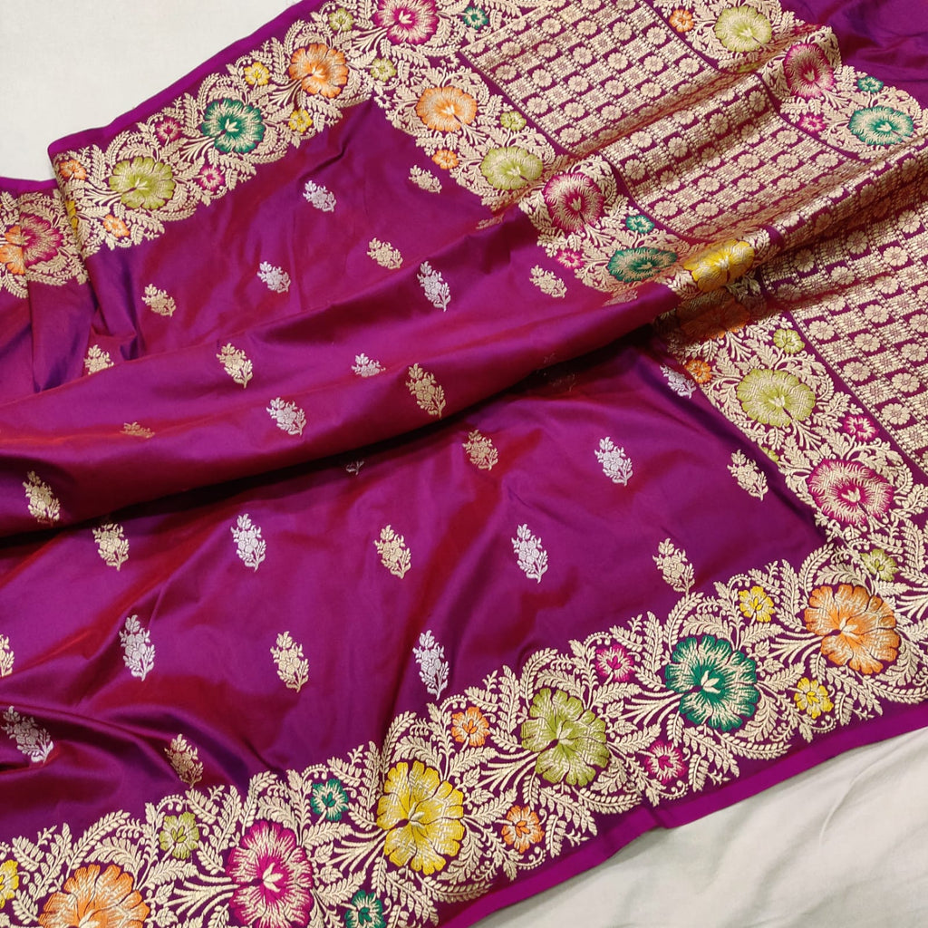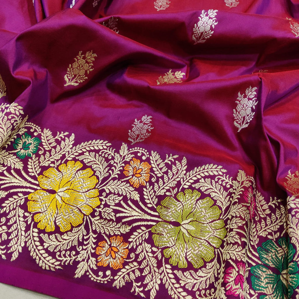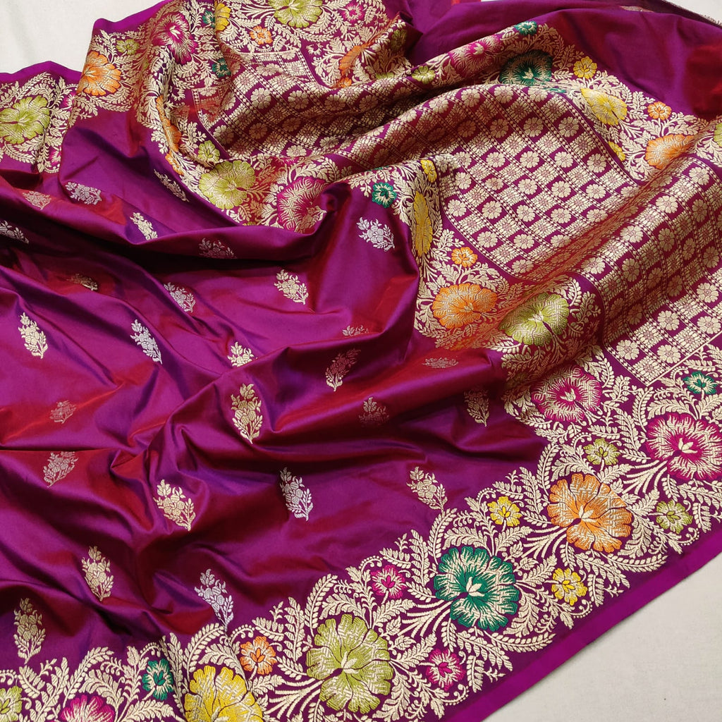 Pure katan silk Handwoven fully kadwa All over silver and gold zari booties with designer multicolor resham meenakari border and contrast piping weaved very much exclusive piece of Banarasi saree