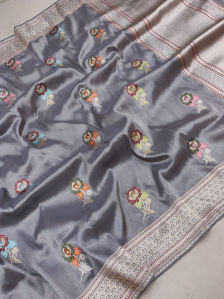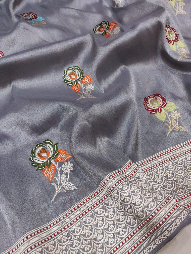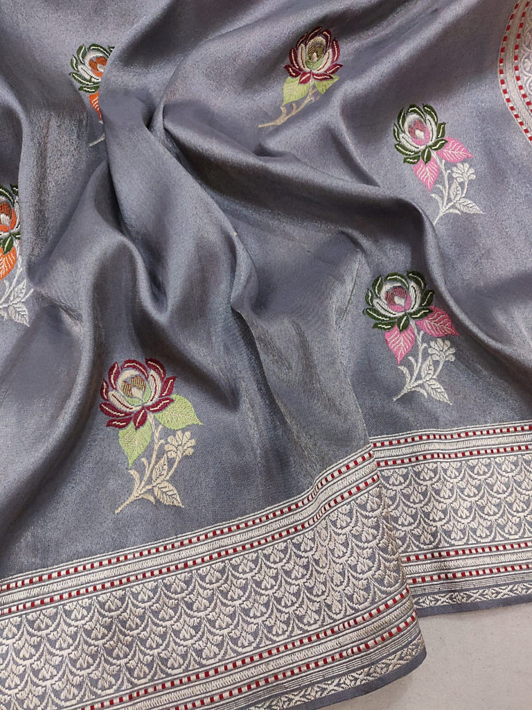 Grey Colour Pure Tissue Silk Handwoven Banarasi Saree