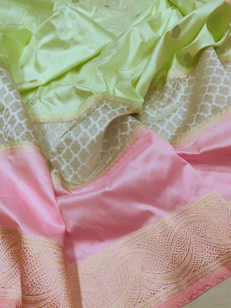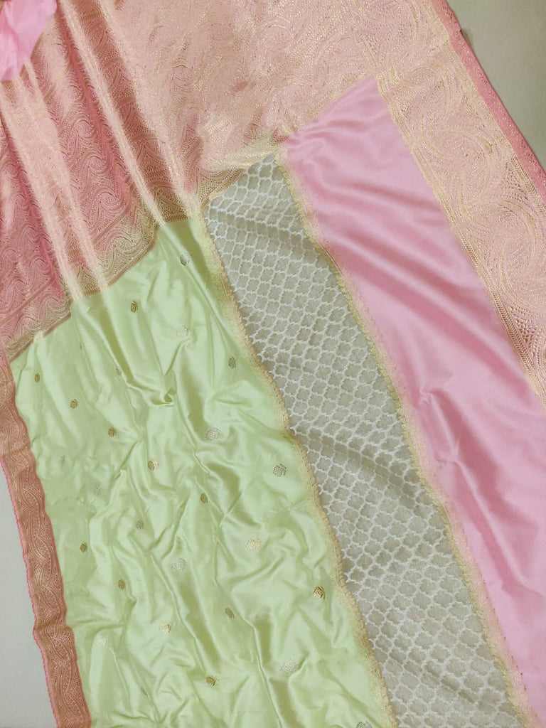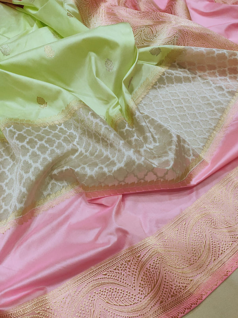 Pure katan silk Handwoven fully kadwa All over silver and gold zari booties with desginer (middle white part is tissue with silver zari jaal and pink part is katan silk) kadhiyal contrast skirt border and pallu weave very much exclusive piece of Banarasi saree