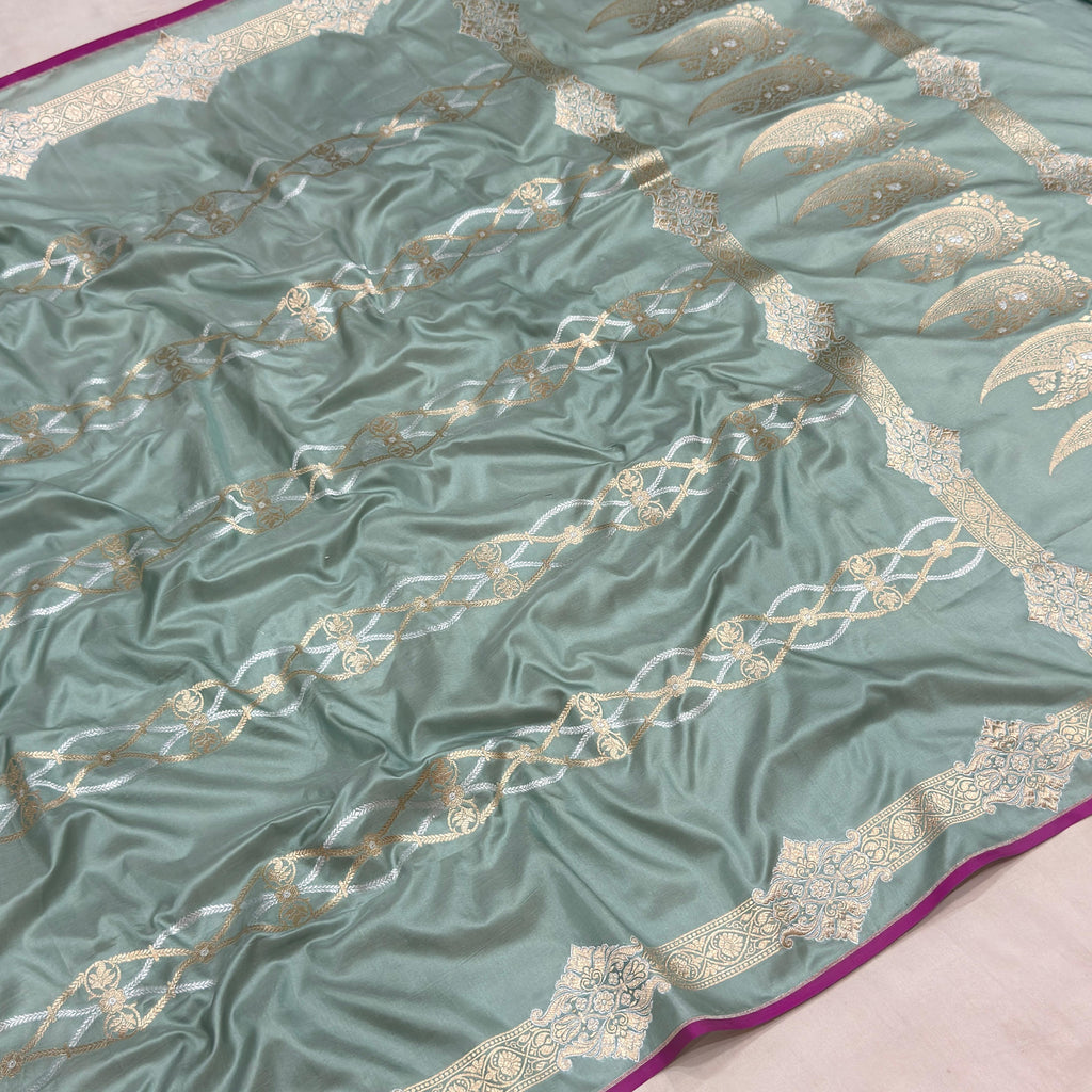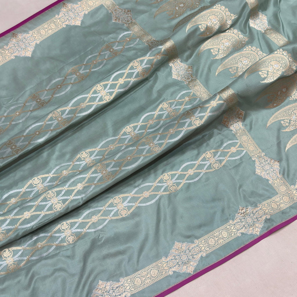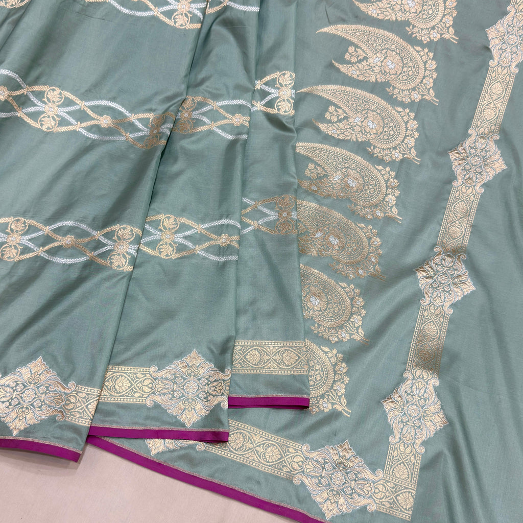 Pure katan Handwoven all over silver and gold zari horizontal chain motifs with silver and gold zari alfi designer rich border, paisley pallu and contrast piping weave very much exclusive piece of Banarasi saree, its very unique design after drap it will enhance the look.