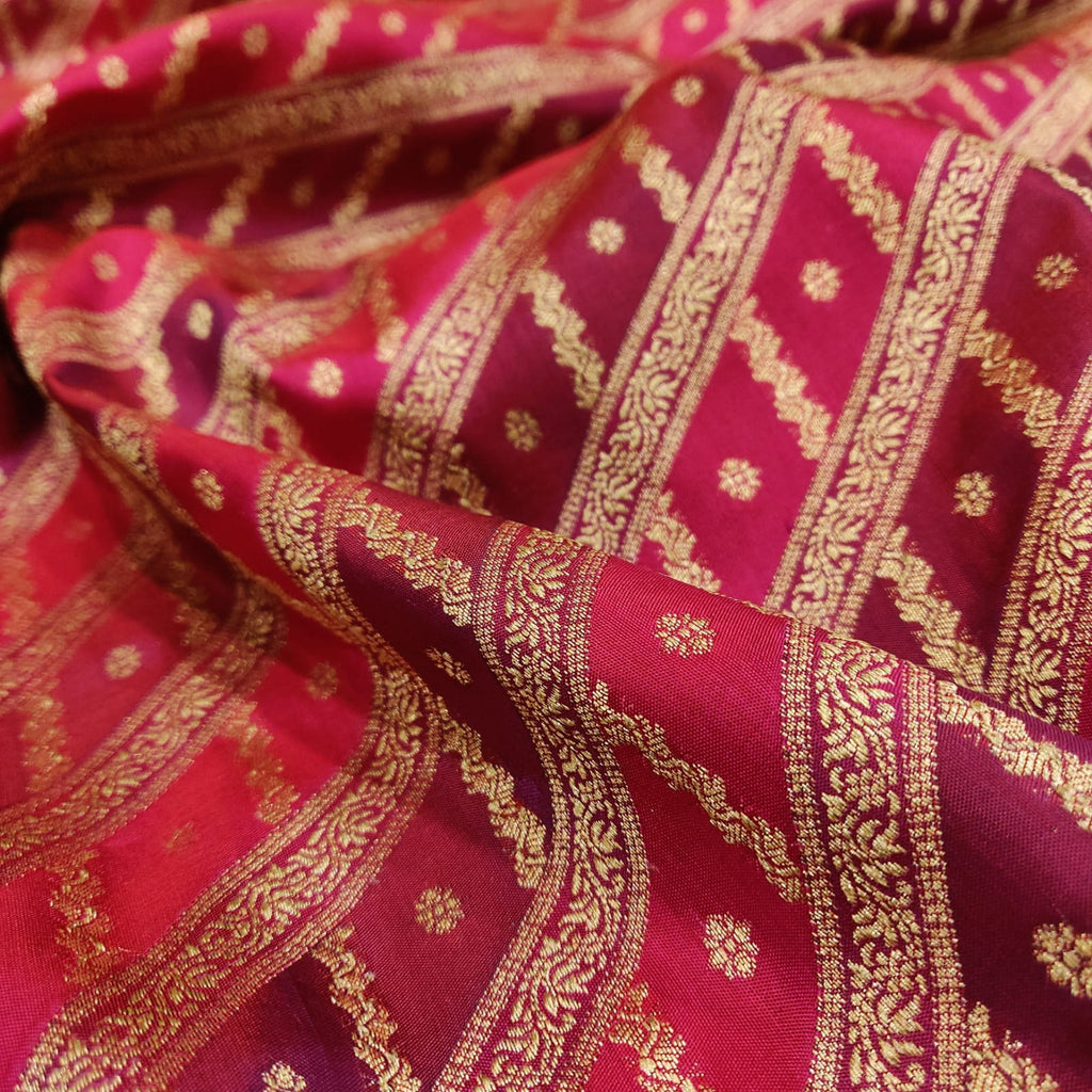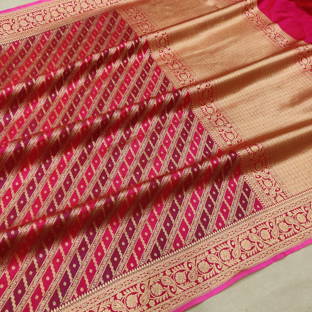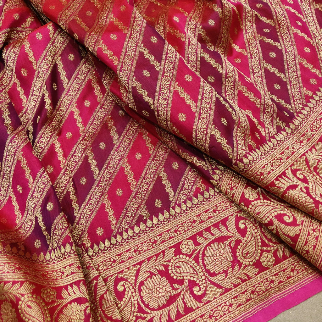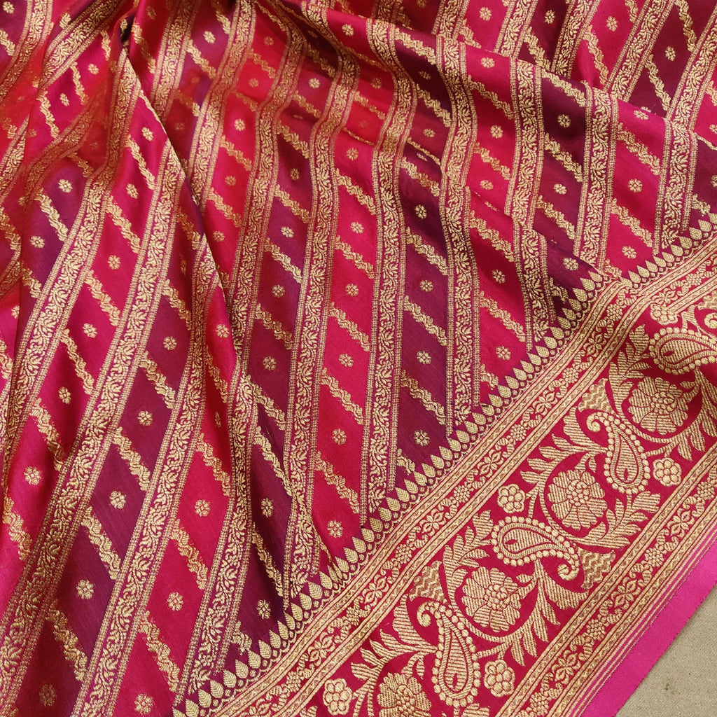 Pure katan silk Handwoven all over gold zari motifs and two colour geometrical rangkat base with gold zari border and pallu weave very much exclusive piece of Banarasi saree