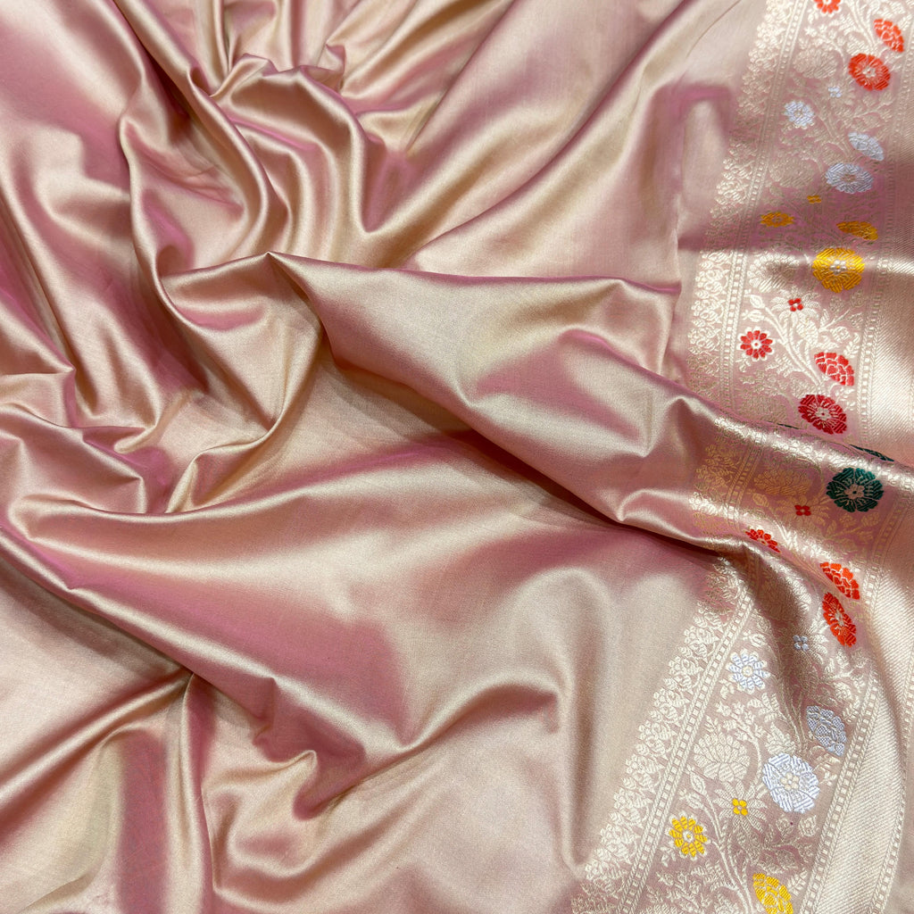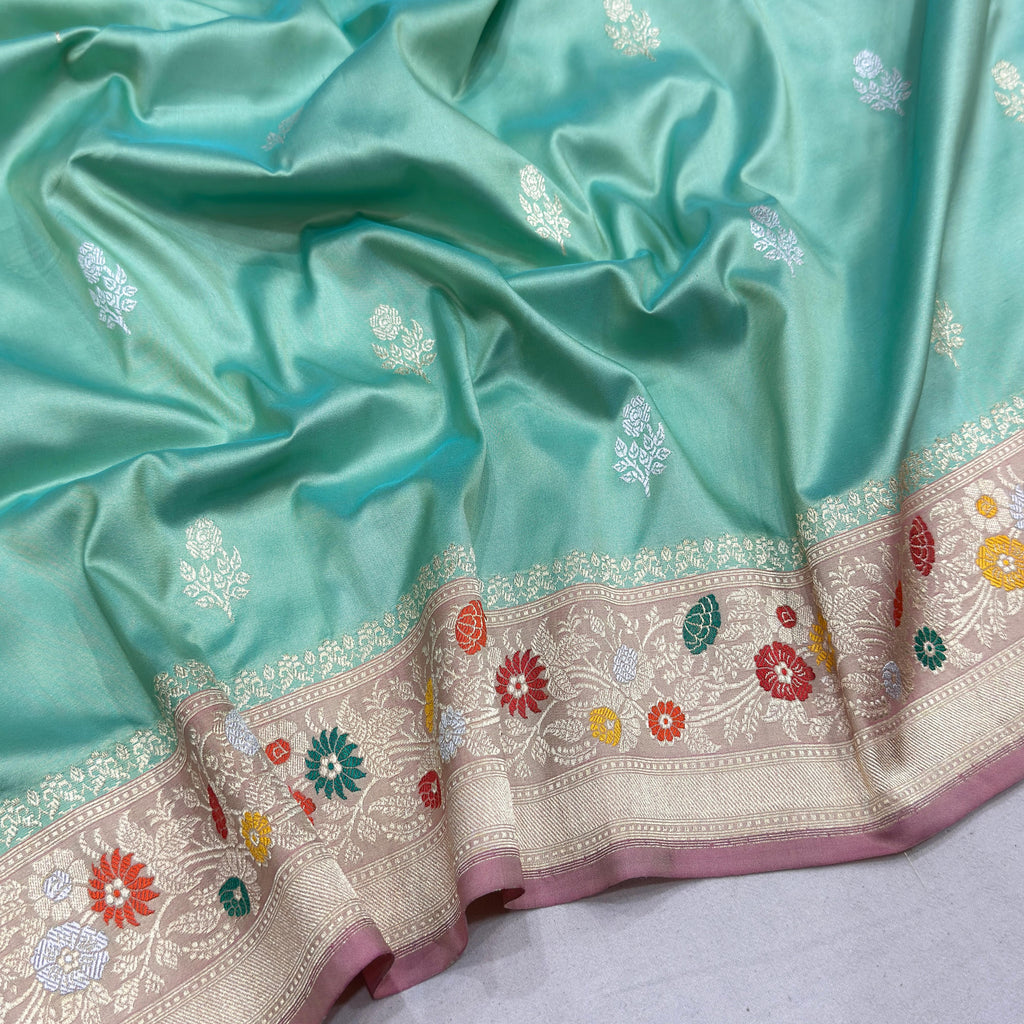 Pure katan silk Handwoven fully kadwa All over silver and gold zari booties with both side contrast border has designer multicolor resham meenakari weave very much exclusive piece of Banarasi saree