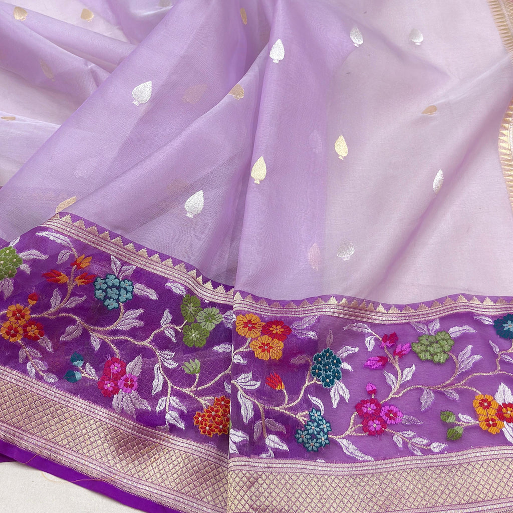 Pure kora Handwoven all over silver and gold zari booties with designer multicolor resham meenakari border weave very much exclusive piece of Banarasi saree