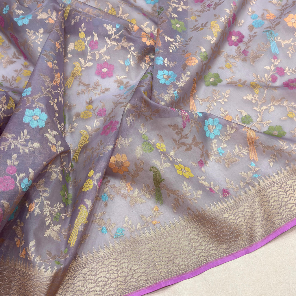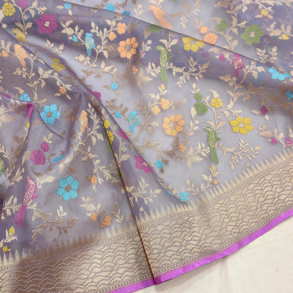 Pure kora handwoven all over gold zari with multicolor resham meenakari bird, flower and alfi jaal motifs with desginer gold zari rich border and pallu weaved very much exclusive piece of Banarasi saree