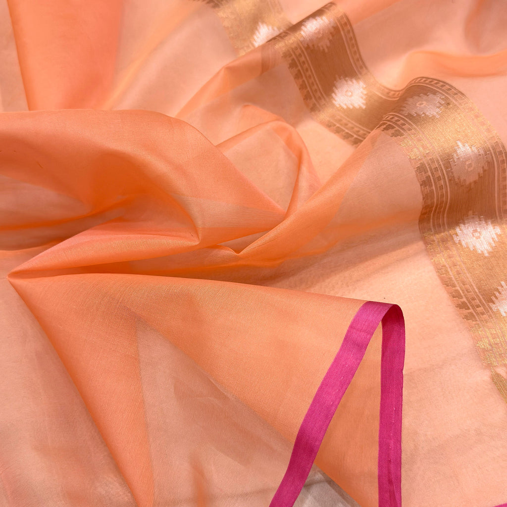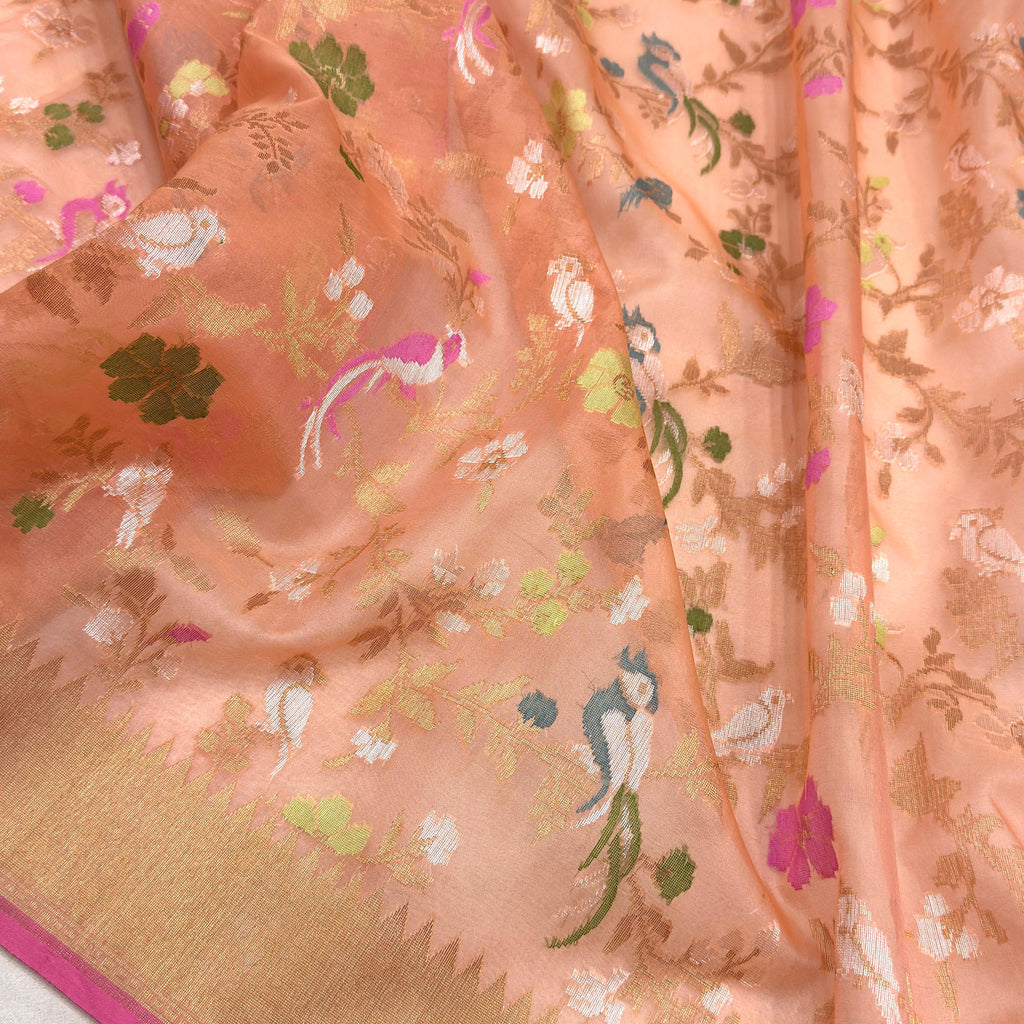 Pure kora handwoven all over gold zari with multicolor resham meenakari bird, flower and tilfi jaal motifs with desginer gold zari rich border and pallu weaved very much exclusive piece of Banarasi saree