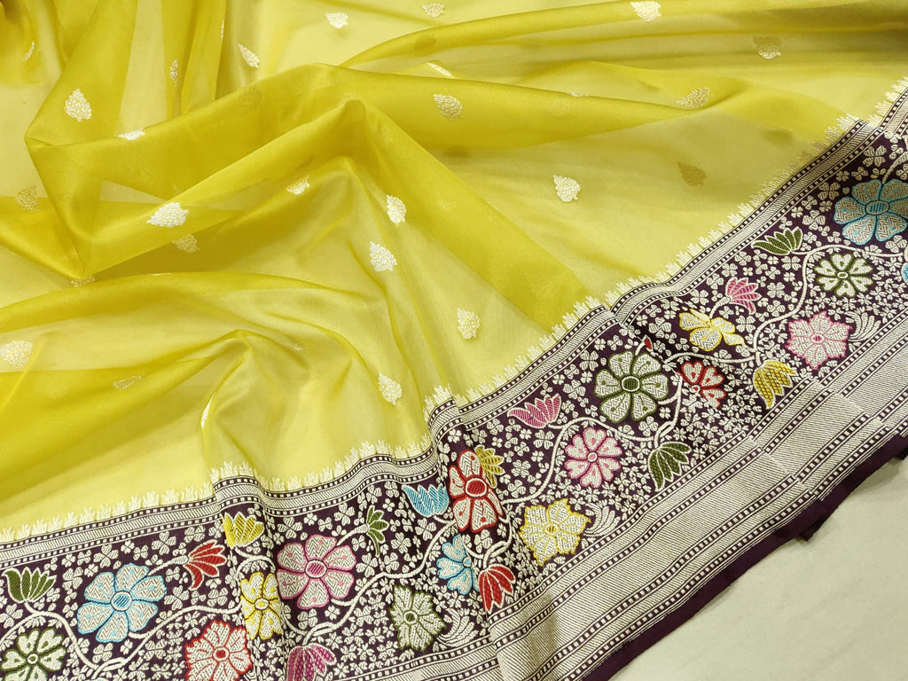 Pure kora silk Handwoven fully kadwa All over silver and gold zari booties with designer multicolor resham meenakari kadhiyal border and pallu weave very much exclusive piece of Banarasi saree