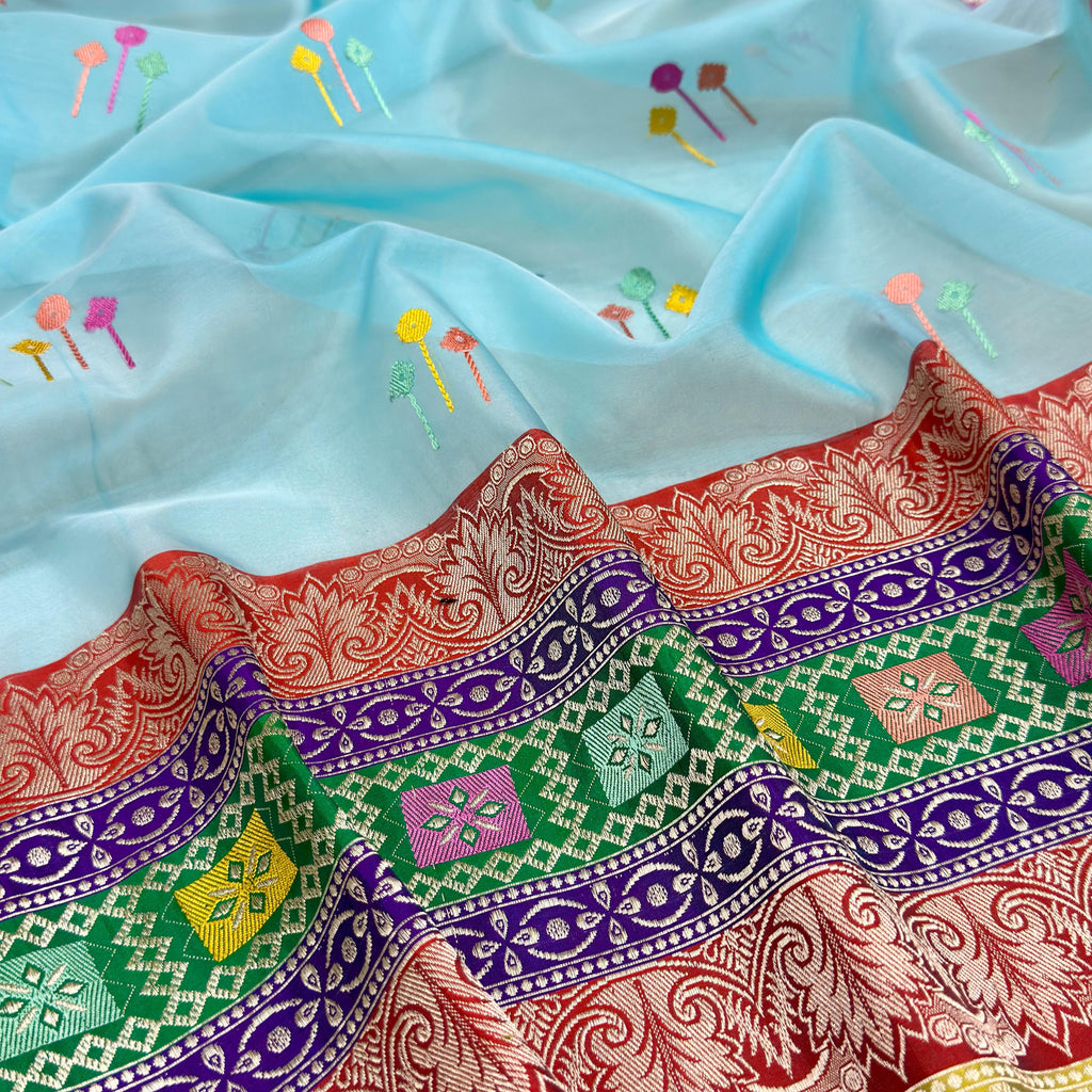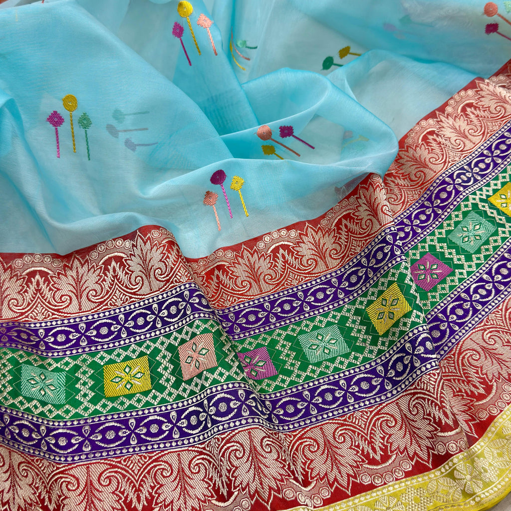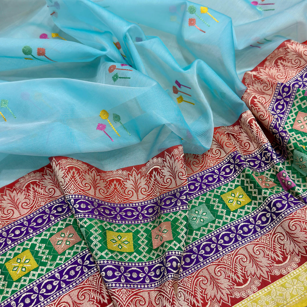 Pure kora Handwoven fully kadwa All over multicolour resham meenakari booties with designer gold zari and multicolour rangkat border , rich pallu weave very much exclusive piece of Banarasi saree