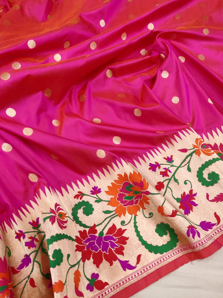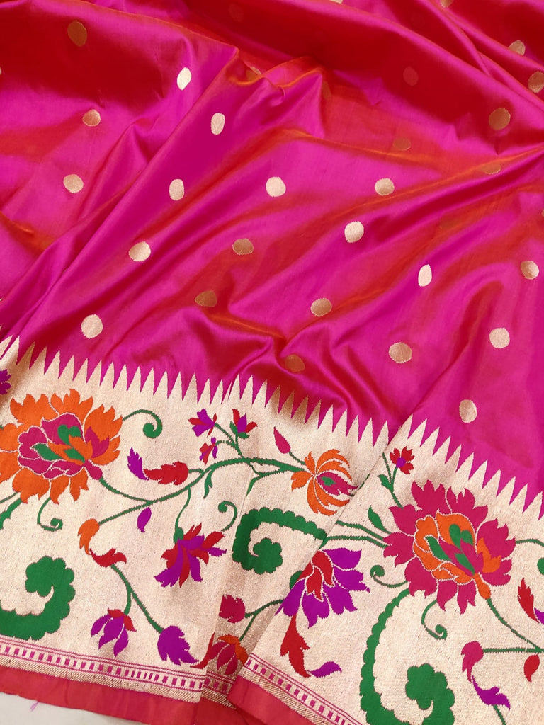Pure katan silk Handwoven all over gold zari booties with designer multicolor resham meenakari chauthera paithani border and designer pallu weave very much exclusive piece of Banarasi saree