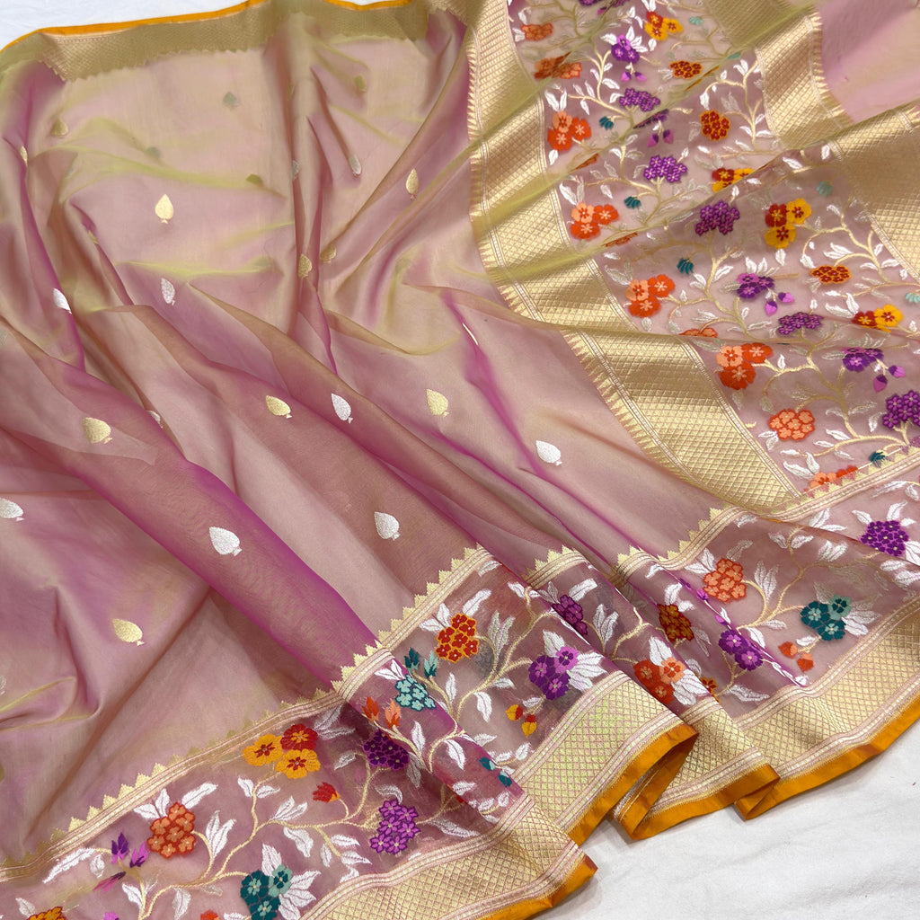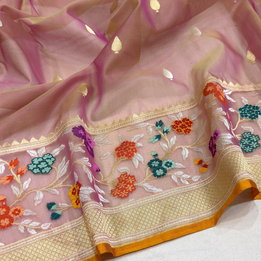 Pure kora Handwoven all over silver and gold zari booties with designer multicolor resham meenakari border weave very much exclusive piece of Banarasi saree