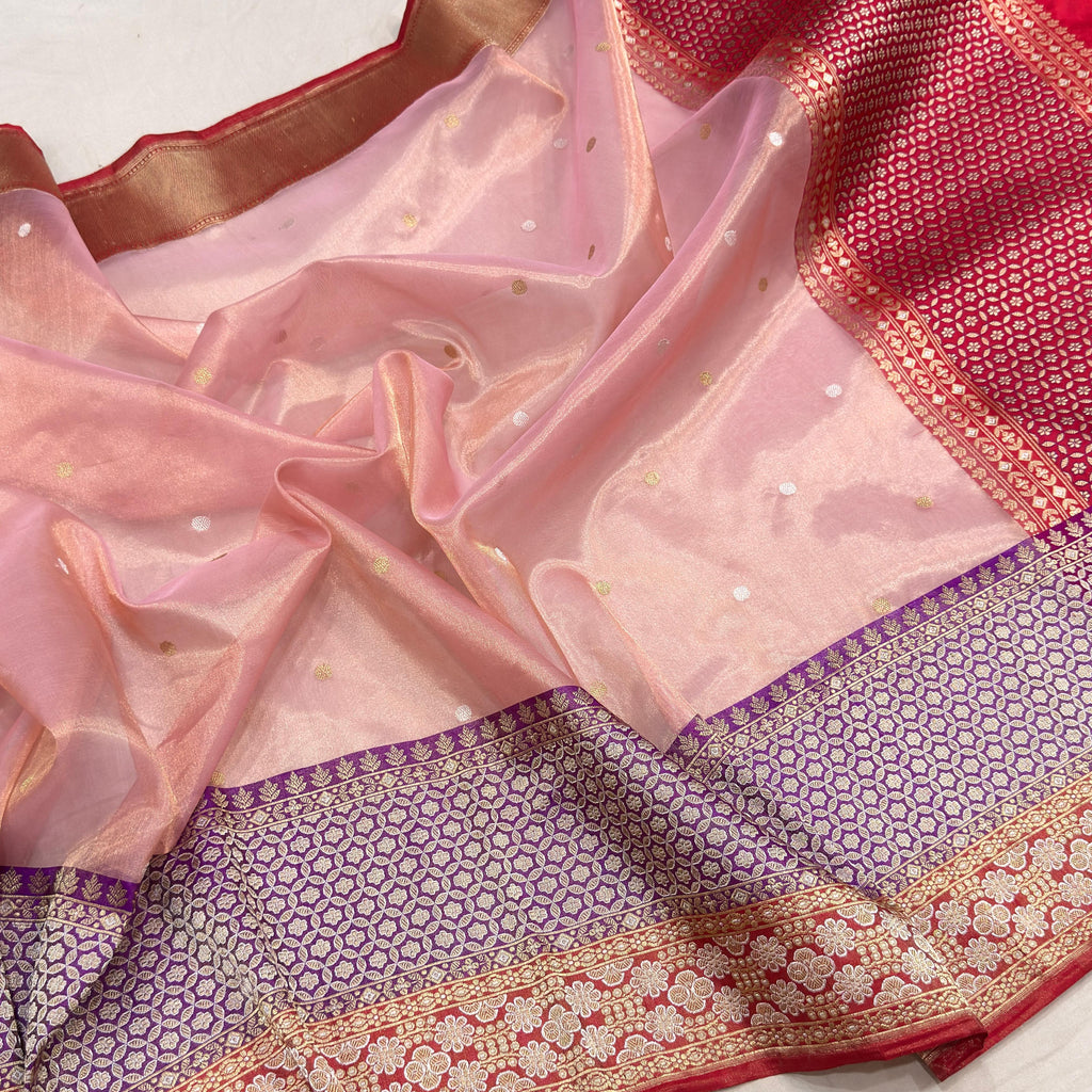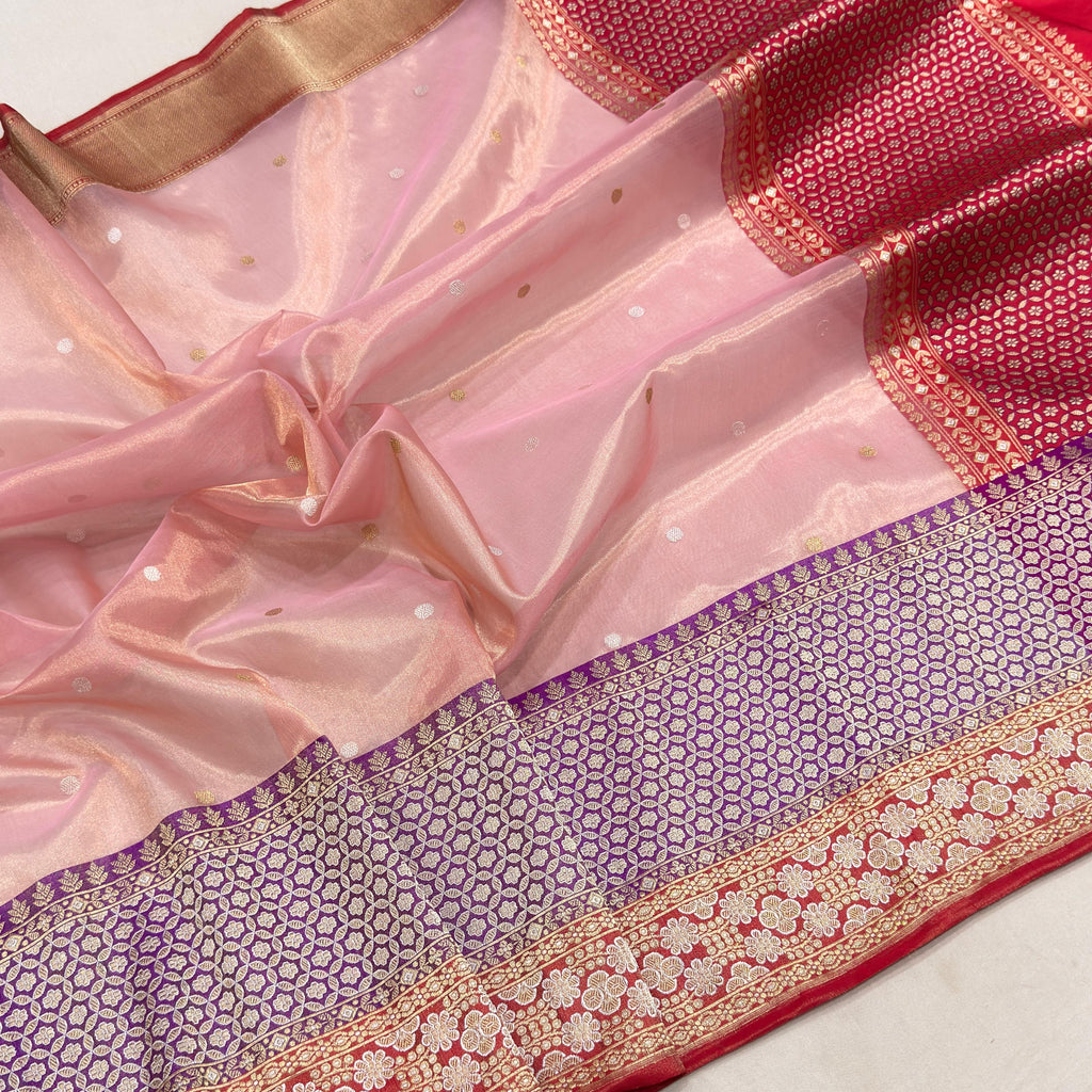 Pure tissue handwoven fully kadwa all over silver and gold zari booties with designer 2 color (magenta & red) base of the border and border motifs has alfi (silver & gold zari), pallu alfi (gold zari and resham) design weave very much exclusive piece of Banarasi saree.