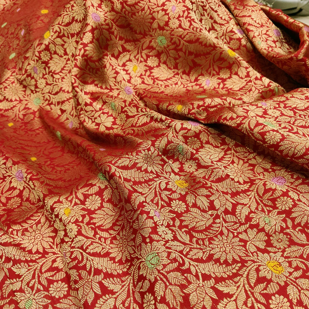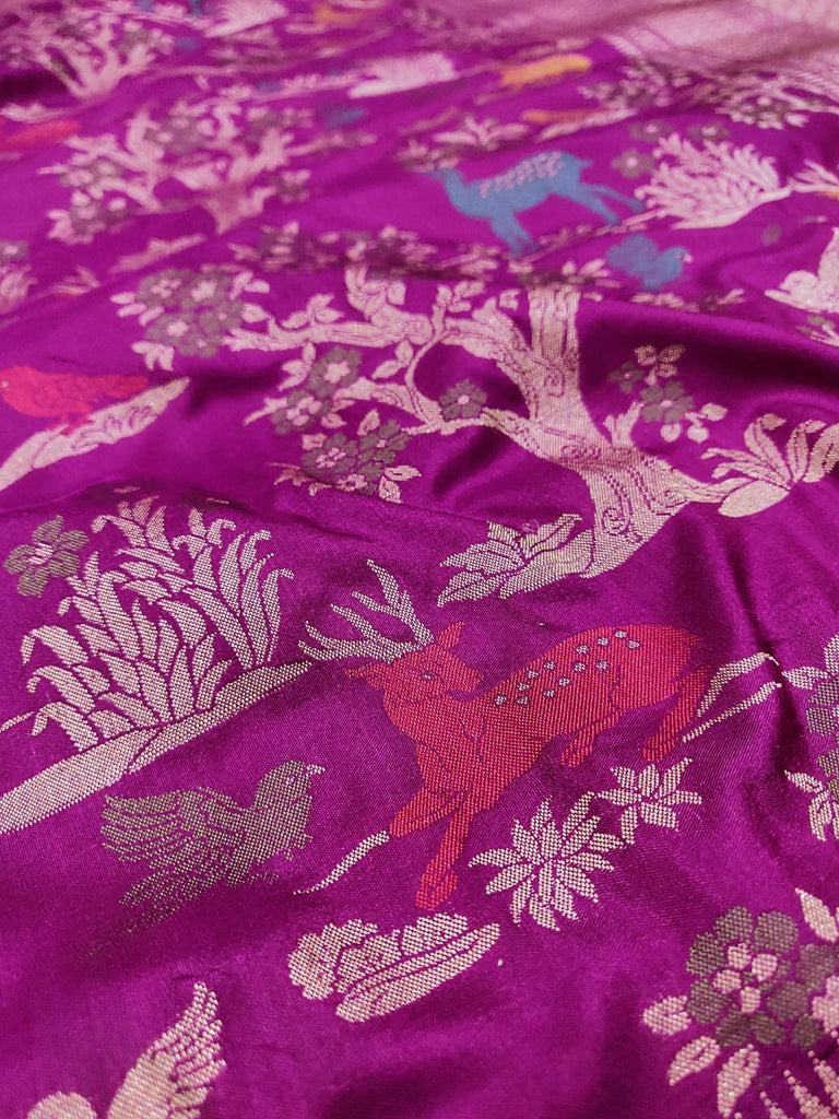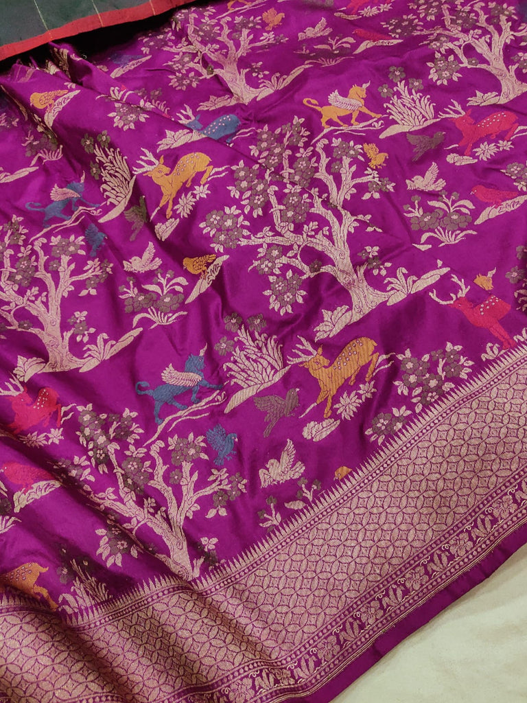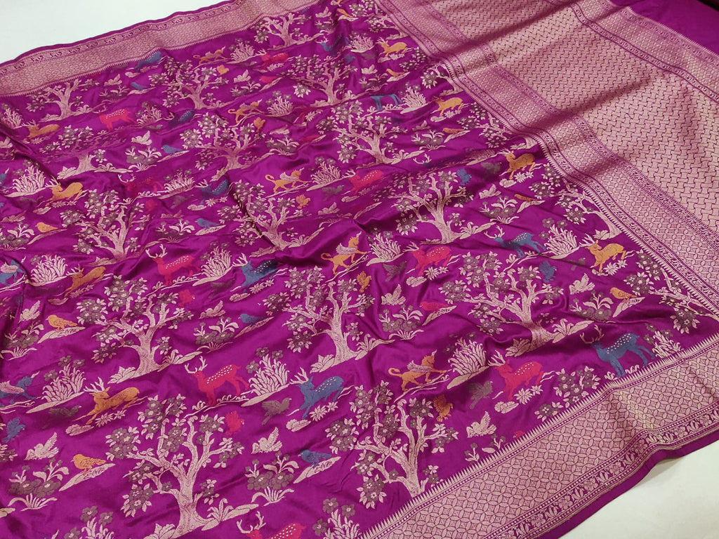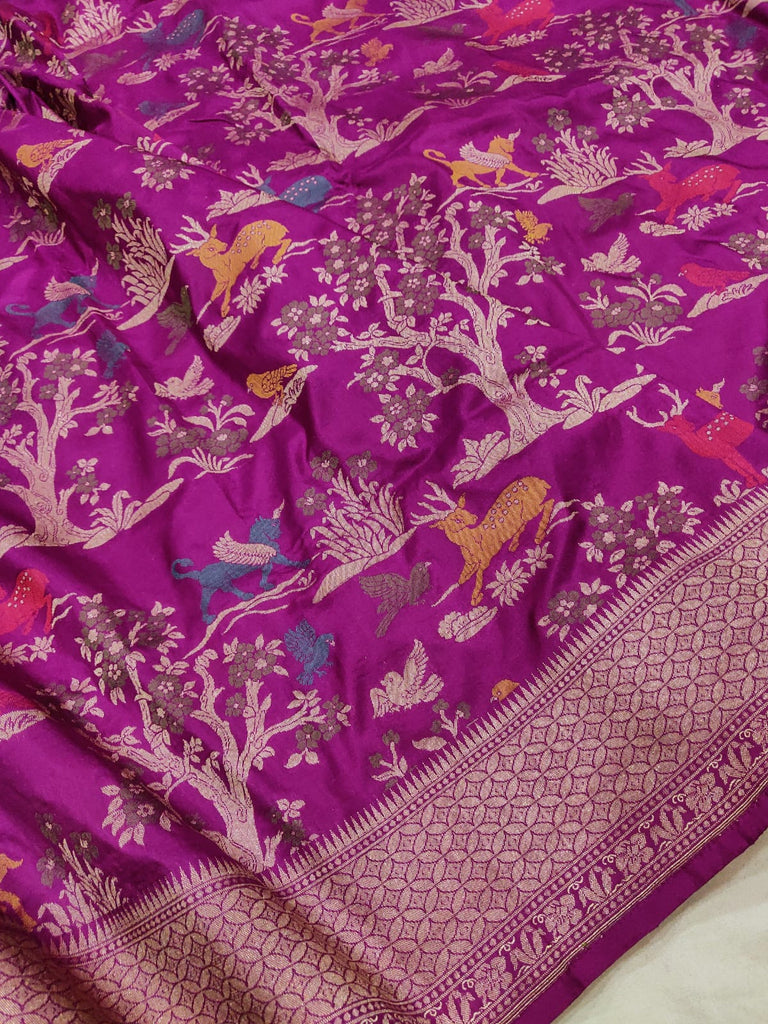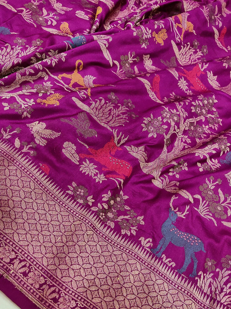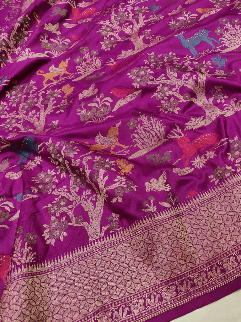 Pure katan silk handwoven all over multicolor resham meenakari bird, animals, and flower motifs with gold zari rich border and designer pallu weave very much exclusive piece of Banarasi saree