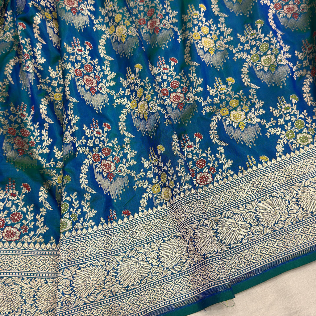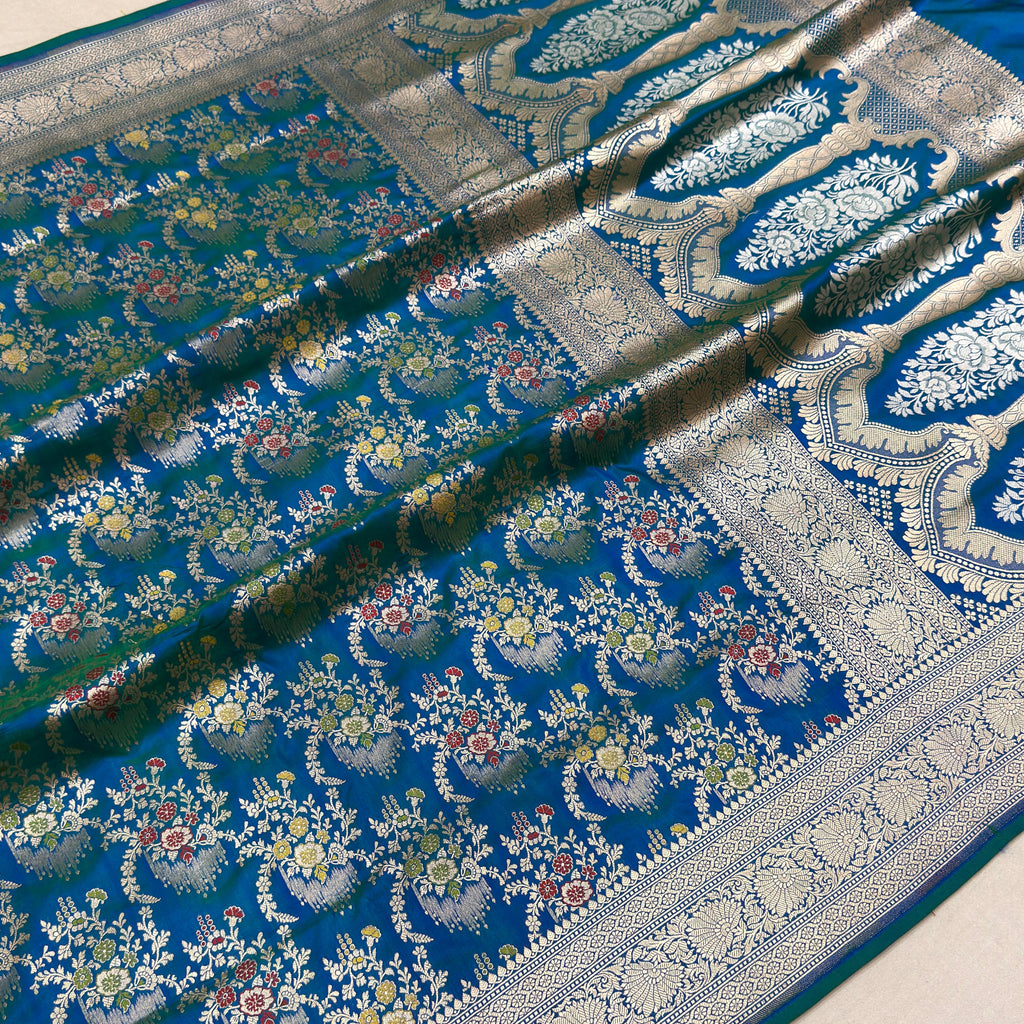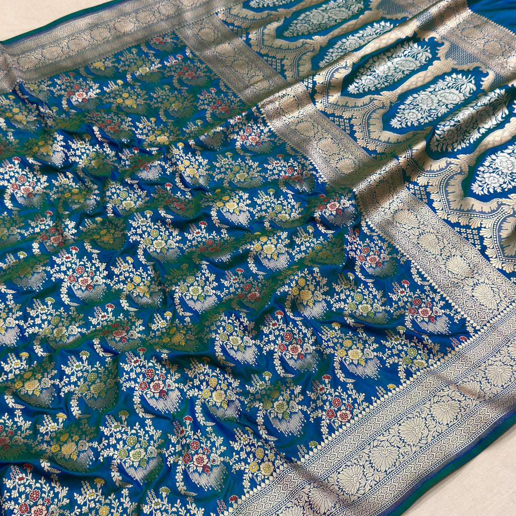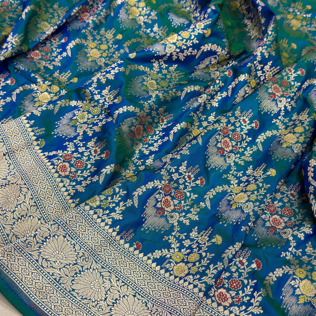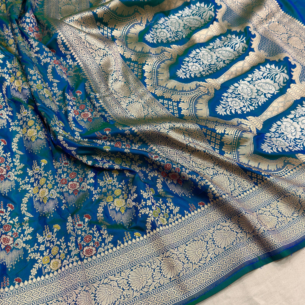 Pure katan silk Handwoven all over gold zari and multicolour resham meenakari jaal motifs with gold zari rich border and pallu weave very much exclusive piece of Banarasi saree