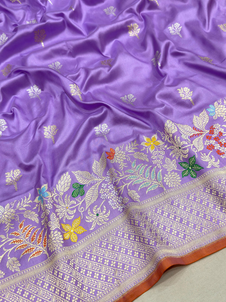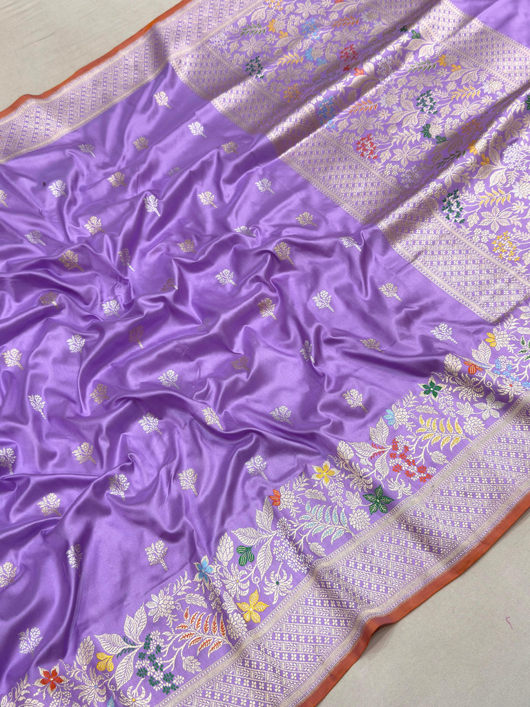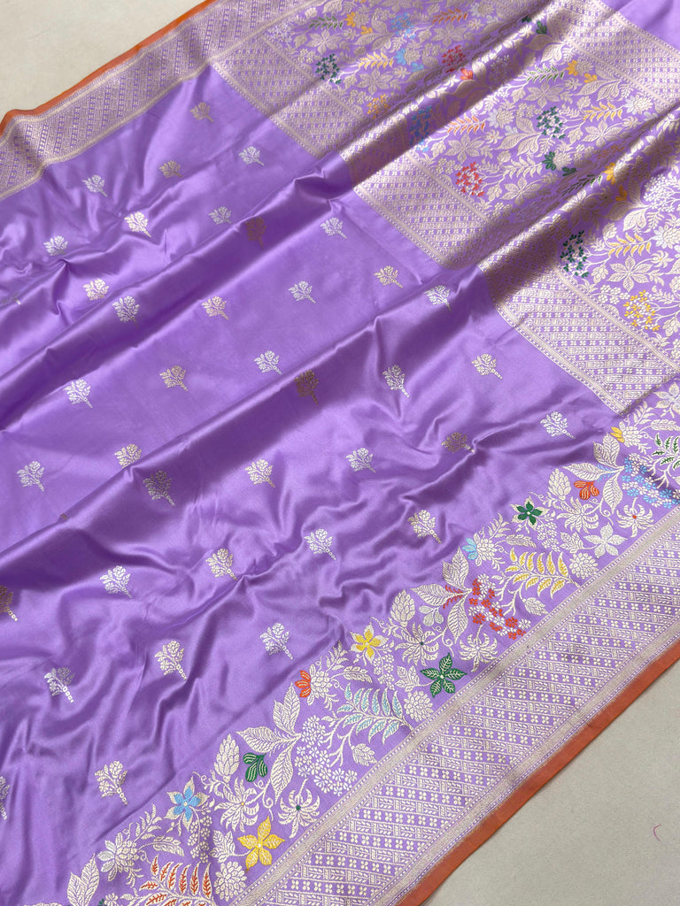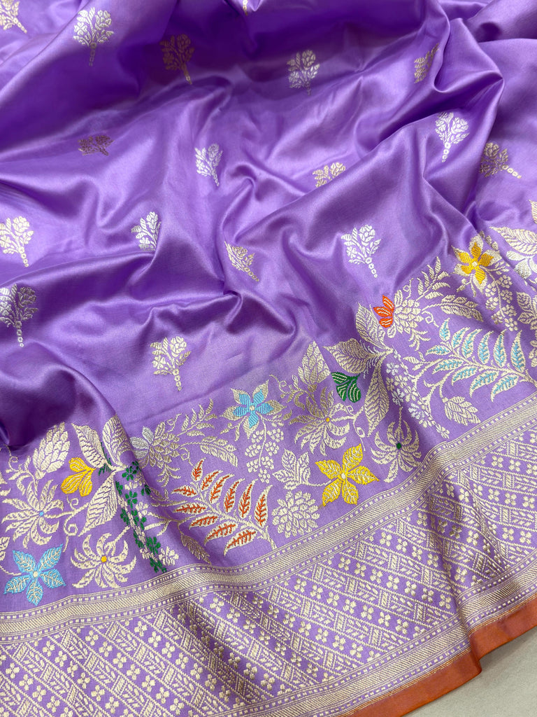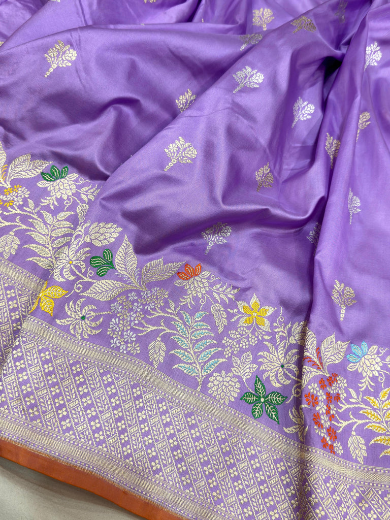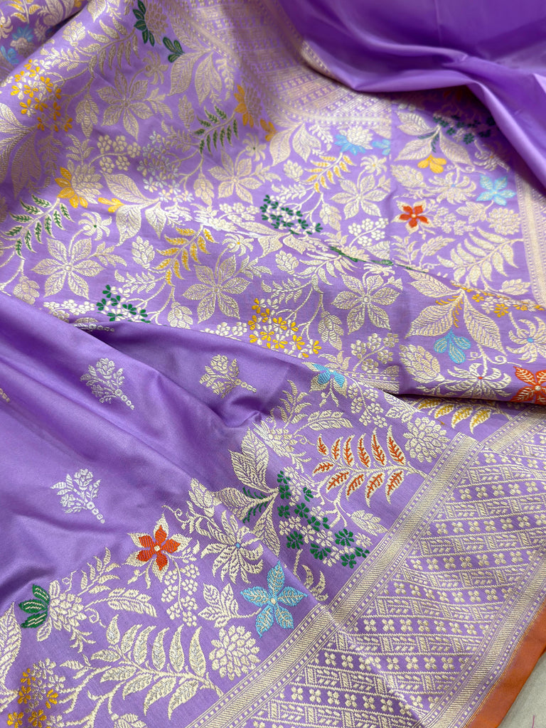 Pure katan silk handwoven all over fully kadwa silver and gold zari booties with desginer multicolour resham and gold zari meenakari skirt border, designer pallu weave very much exclusive piece of Banarasi saree