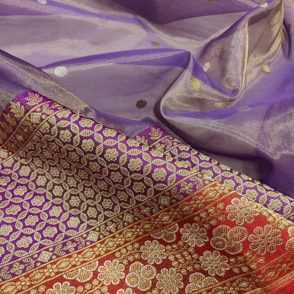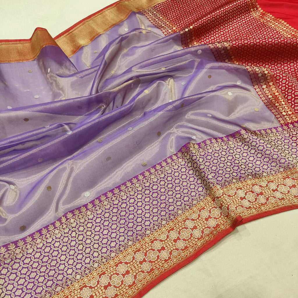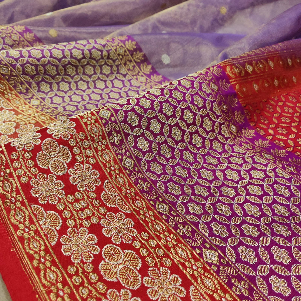 Pure tissue handwoven fully kadwa all over silver and gold zari booties with designer 2 color (magenta & red) base of the border and border motifs has alfi (silver & gold zari), pallu alfi (gold zari and resham) design weave very much exclusive piece of Banarasi saree.