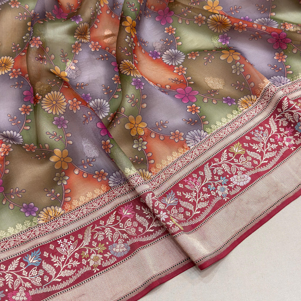 Pure kora Handwoven fully kadwa all over silver and gold zari booties on multicolor designer flower Digital print base with gold zari and multicolour resham meenakari, contrast red border and designer pallu weave very much exclusive piece of Banarasi saree