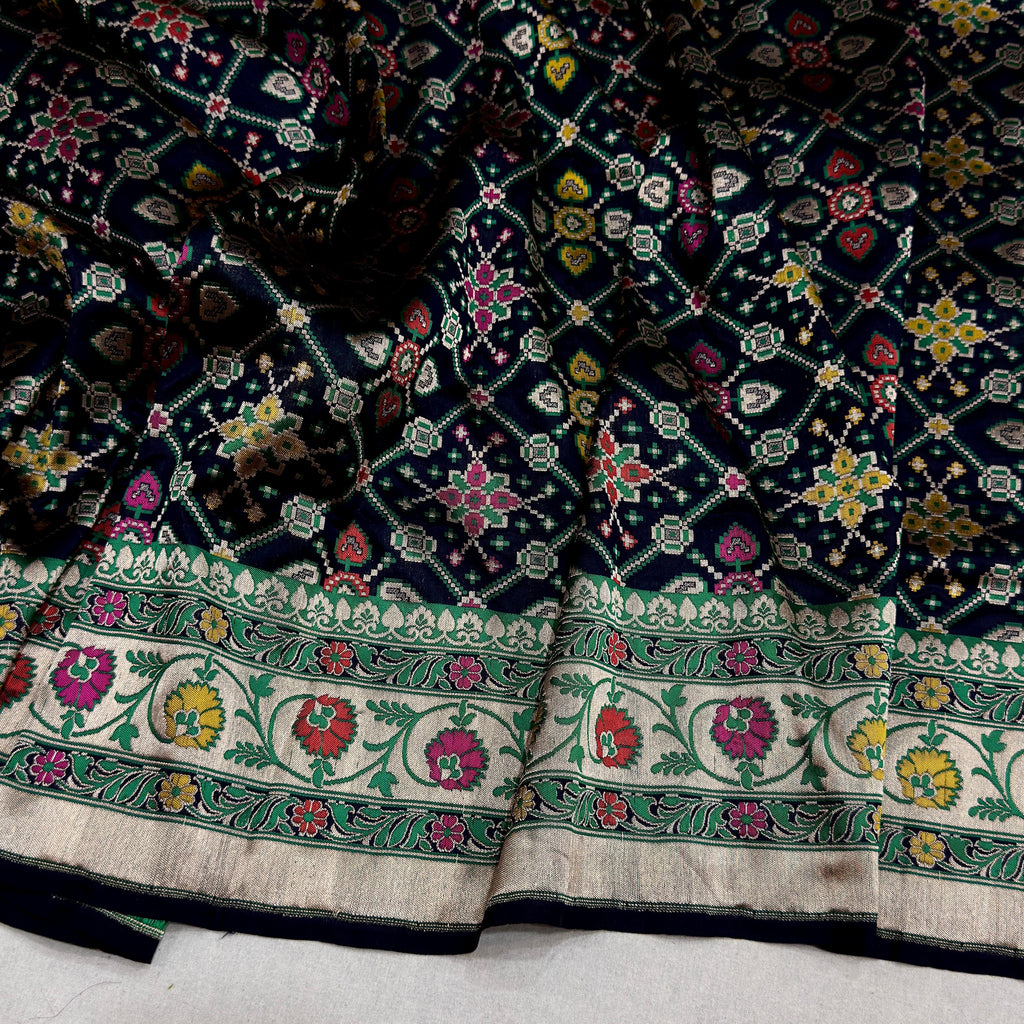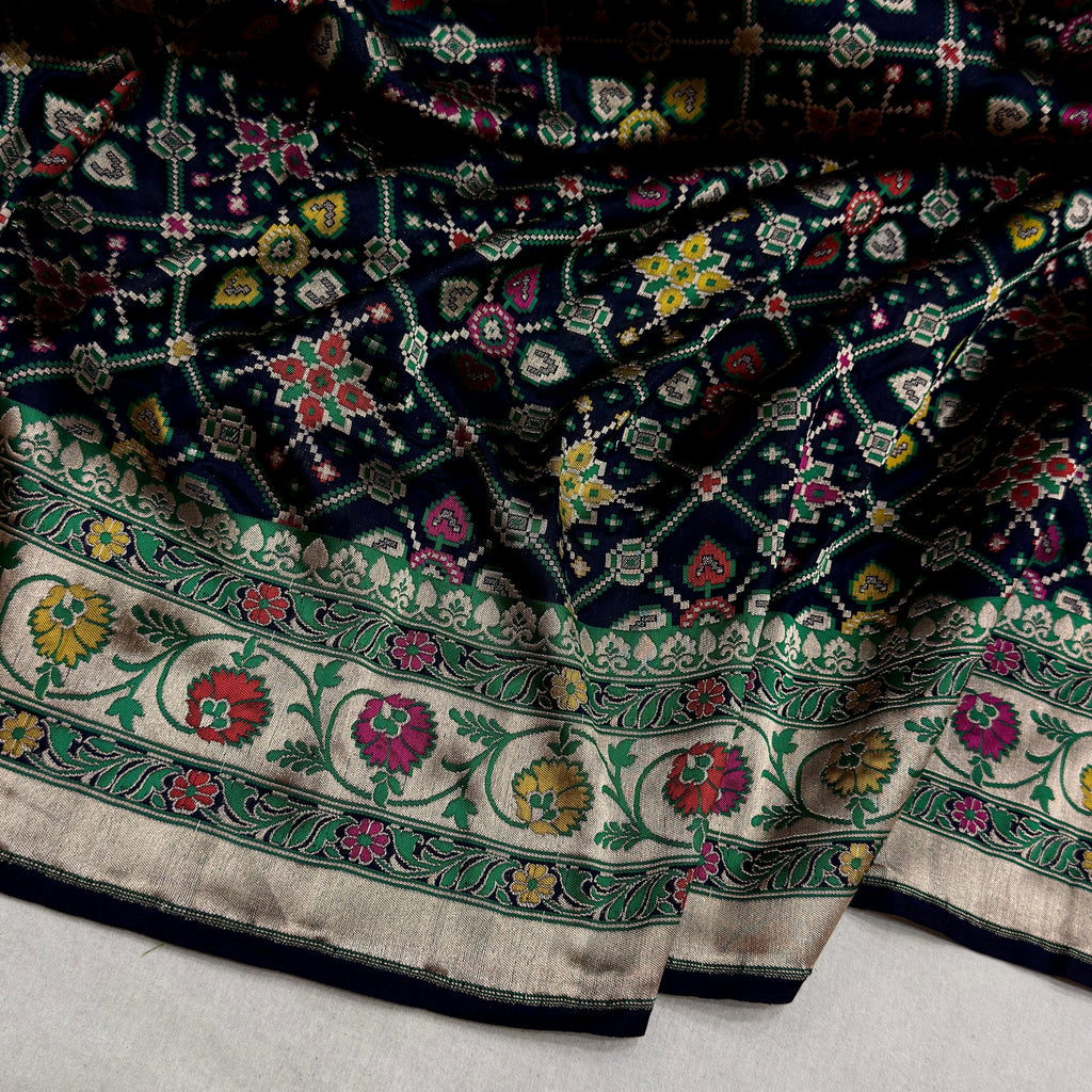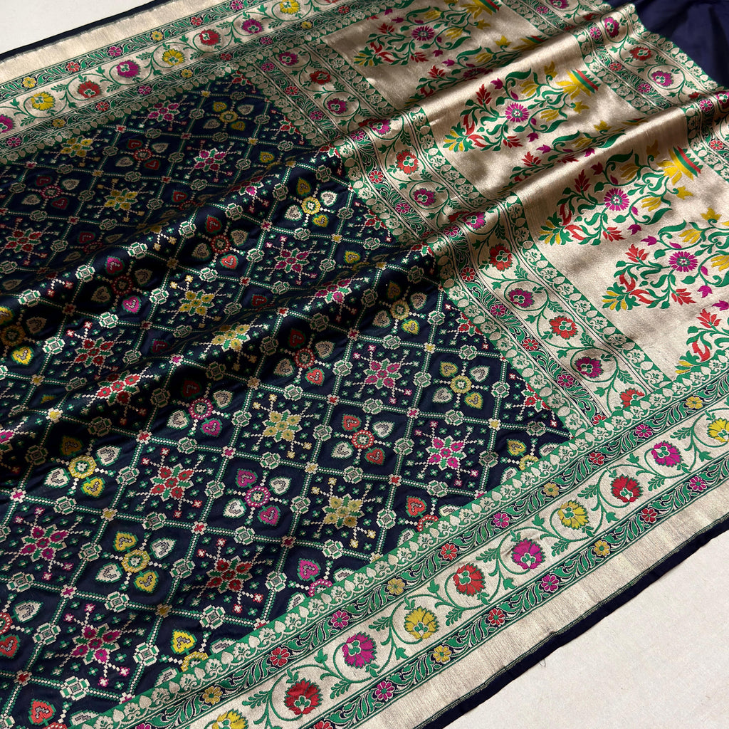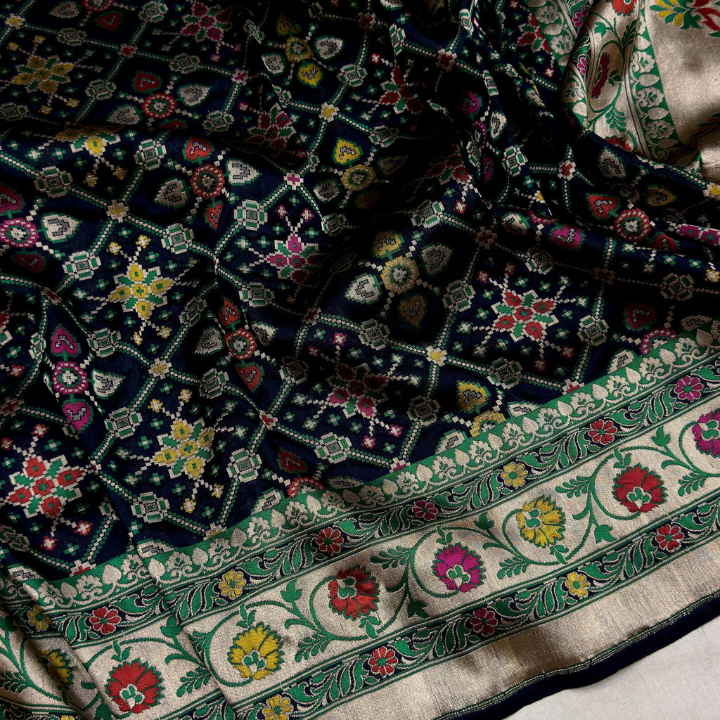 Pure katan silk Handwoven all over gold zari and multicolor resham meenakari chaukhdi base with multicolor resham meenakari, gold zari rich border and pallu weave very much exclusive piece of Banarasi pathan patola saree