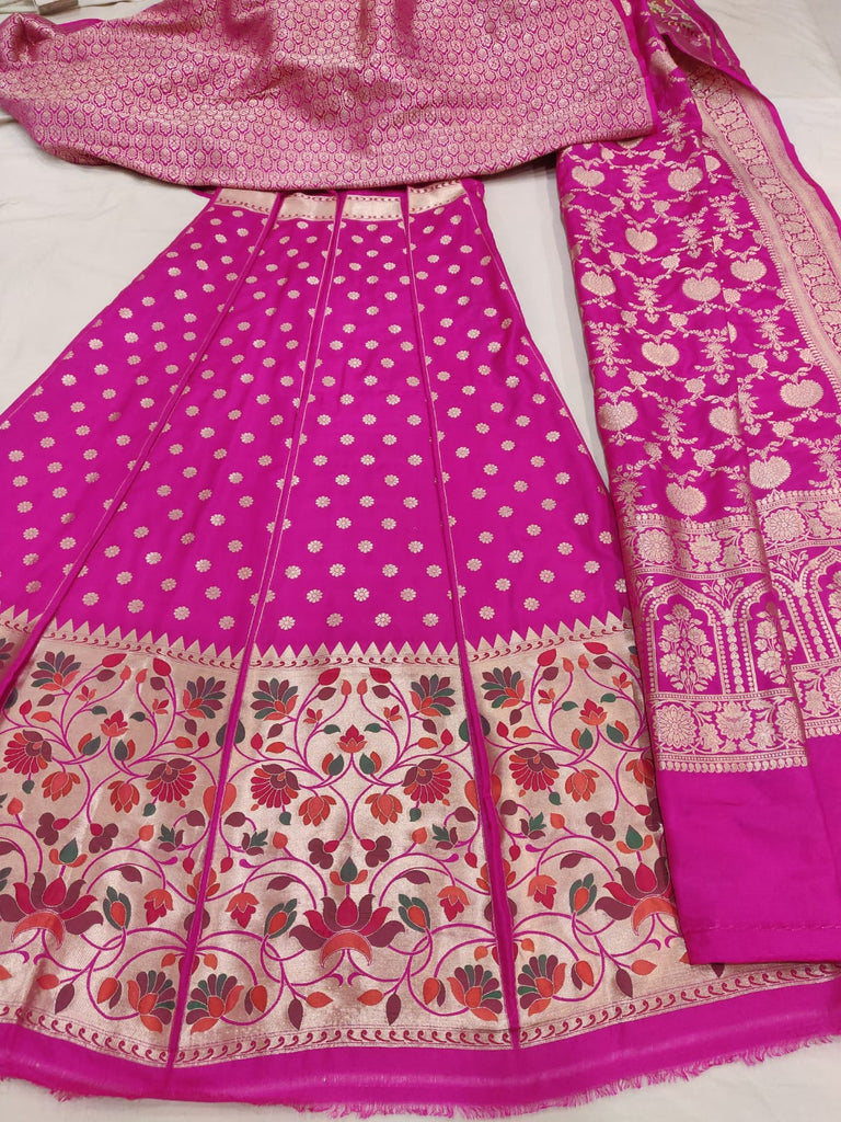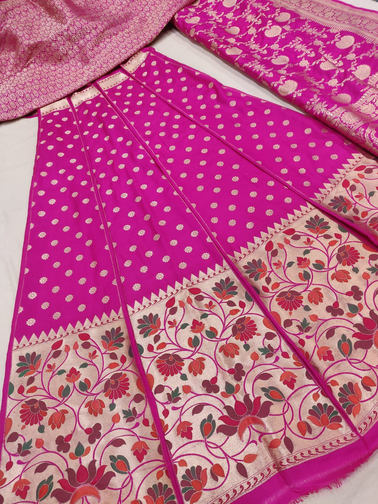 Pure katan silk Handwoven all over gold zari booties on top of the kalli and multicolour resham meenakari pathani style motifs on bottom part of the kalli weave very much exclusive piece of Banarasi lehnga and blouse.