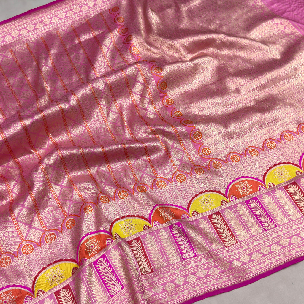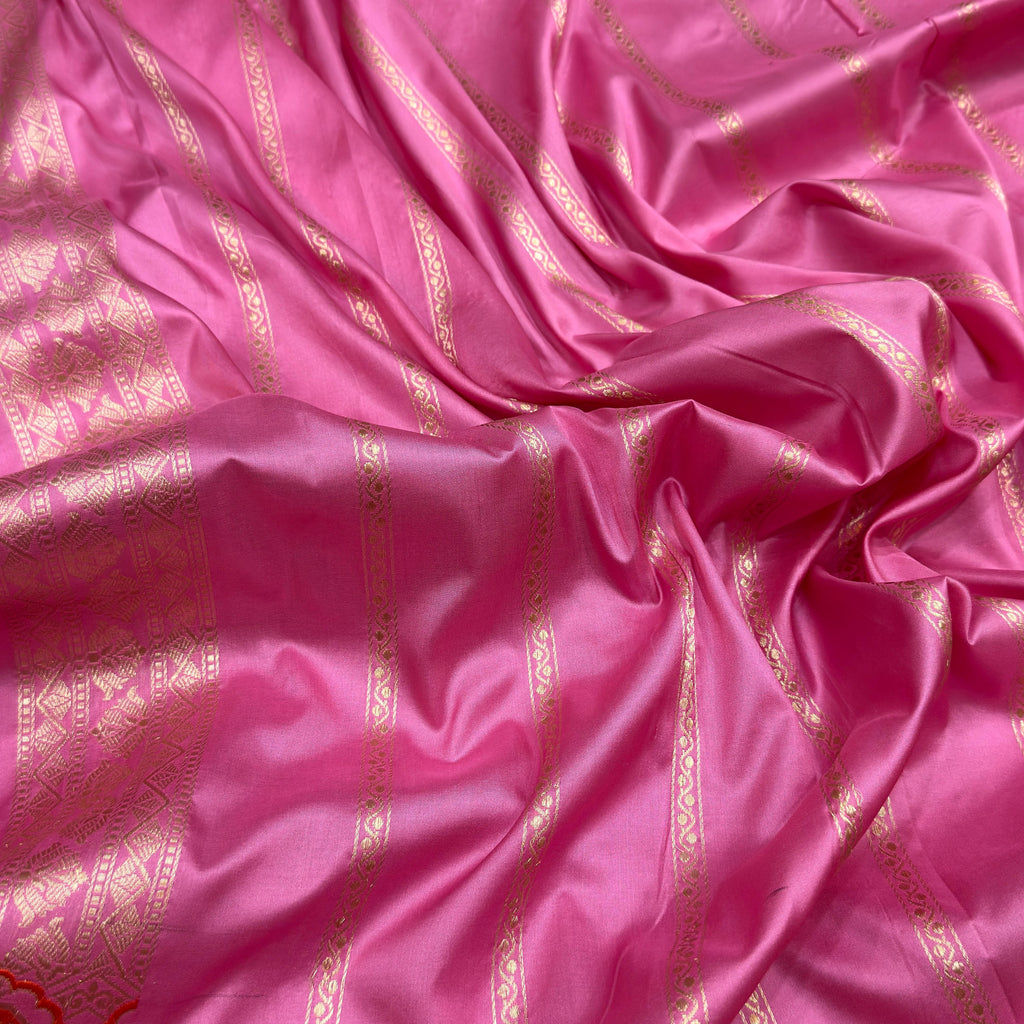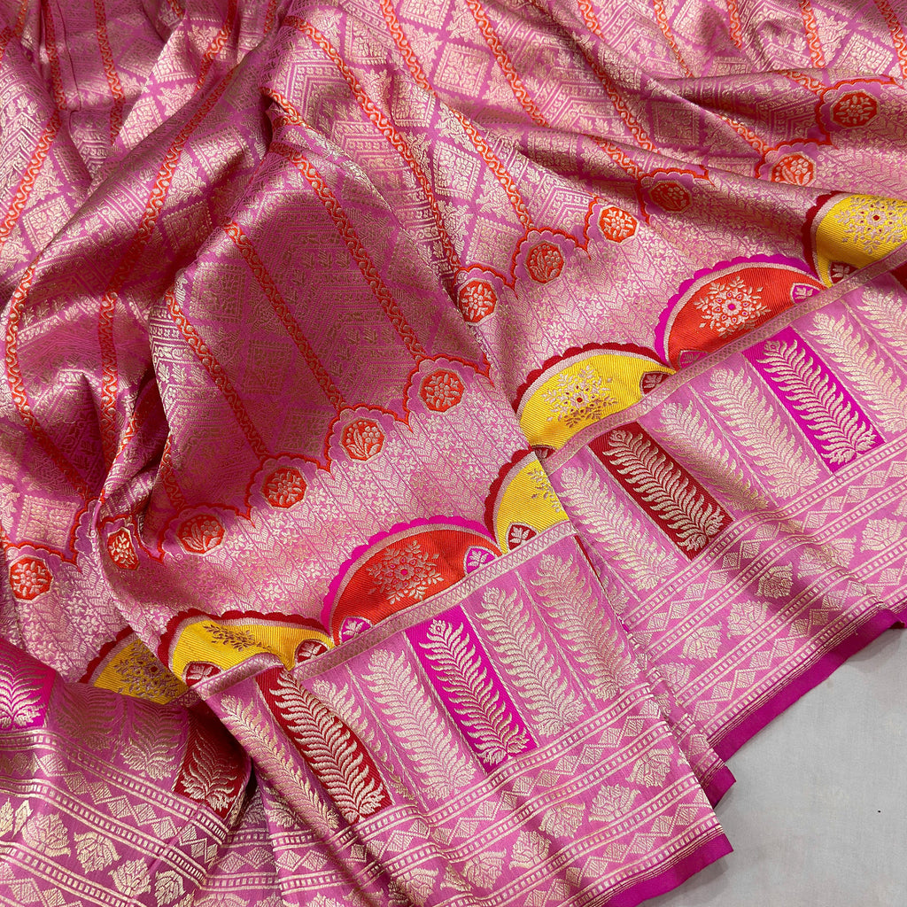 Pure katan silk Handwoven all over gold zari and orange colour resham, brocade base with gold zari and multicolour resham meenakari designer skirt border and pallu weave very much exclusive piece of Banarasi saree
