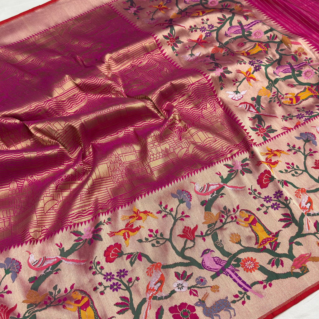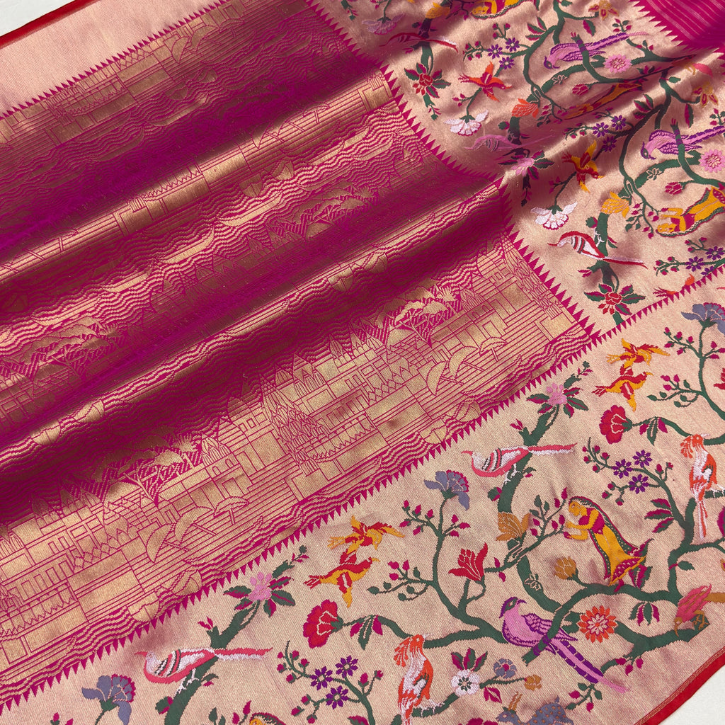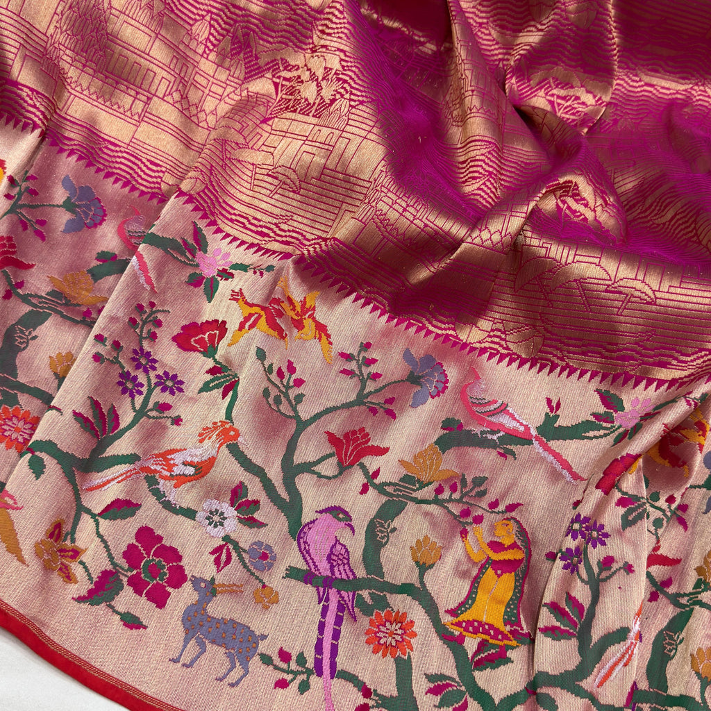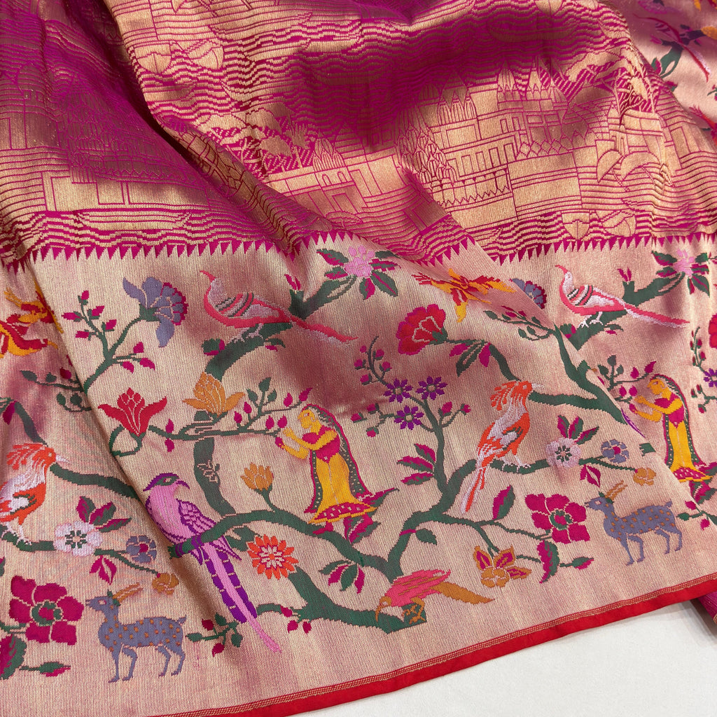 Pure katan silk Handwoven all over tanchoi ghat motifs on base with Banarasi skirt featuring village girls ,animals and birds paithani border and designer pallu weave very much exclusive piece of Banarasi saree.