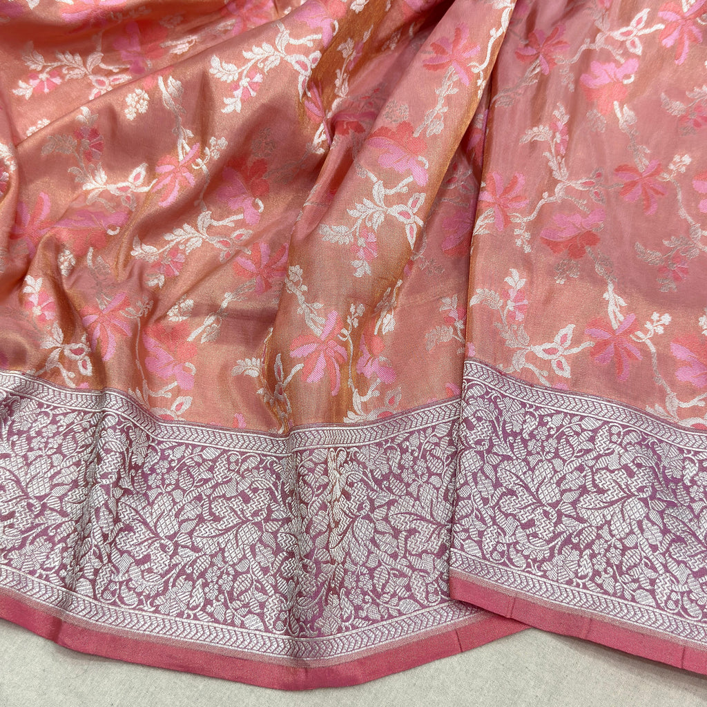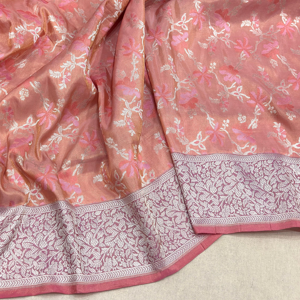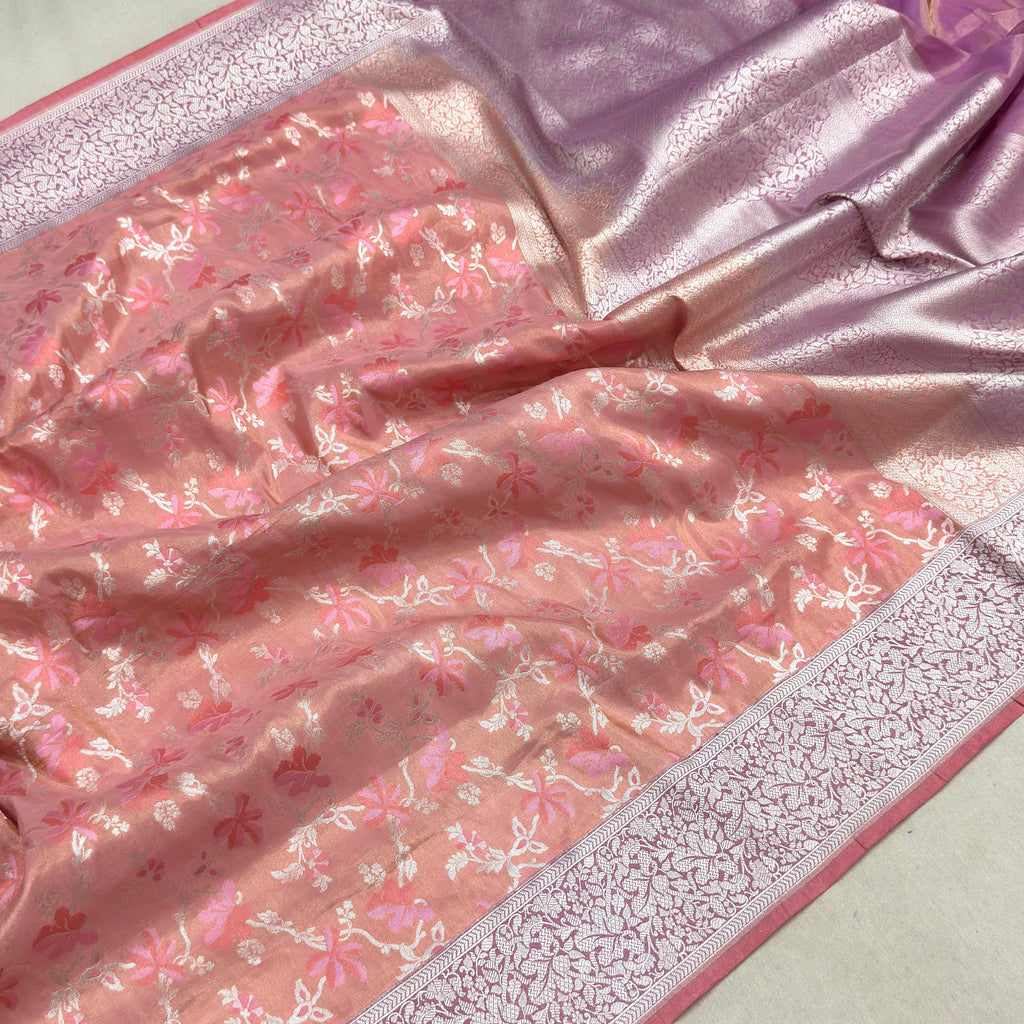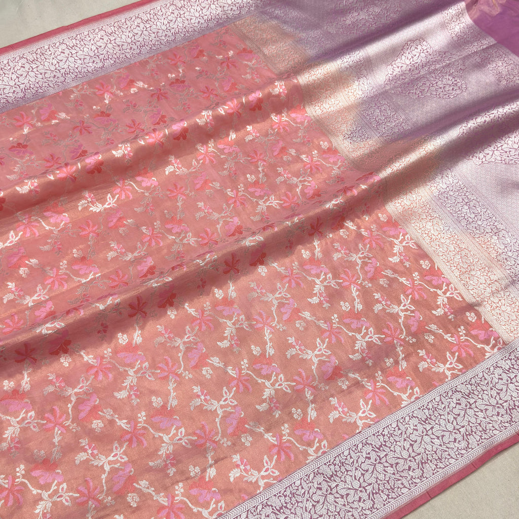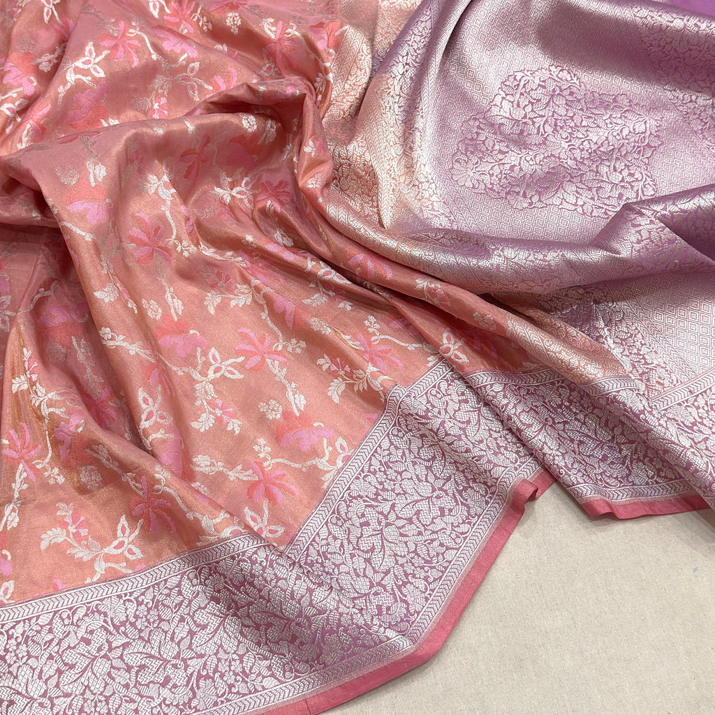 Pure tissue silk Handwoven all over silver zari and two colours resham meenakari tilfi jaal motifs with silver zari border and pallu weave very much exclusive piece of Banarasi saree