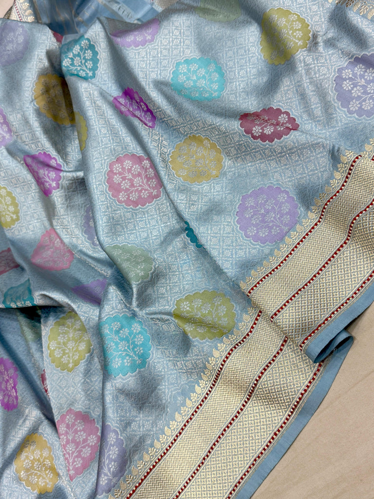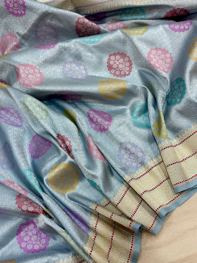 Pure katan silk Handwoven all over silver zari Tanchoi base and multicolour rangkat bootas with rich border and pallu weave very much exclusive piece of Banarasi saree