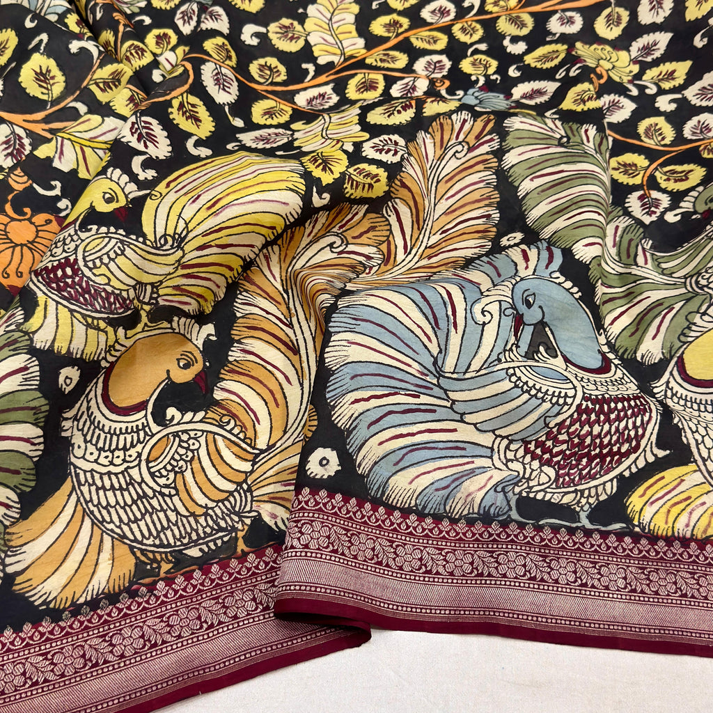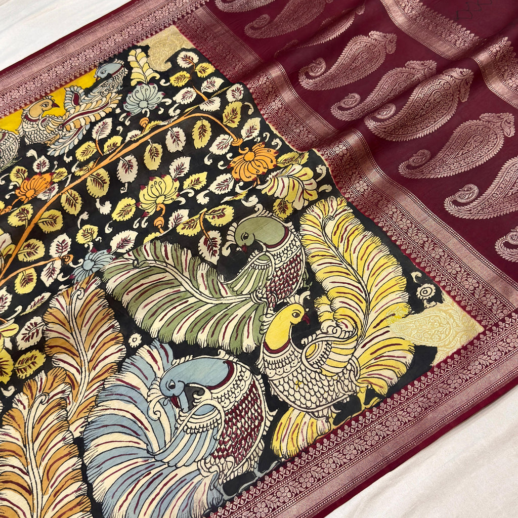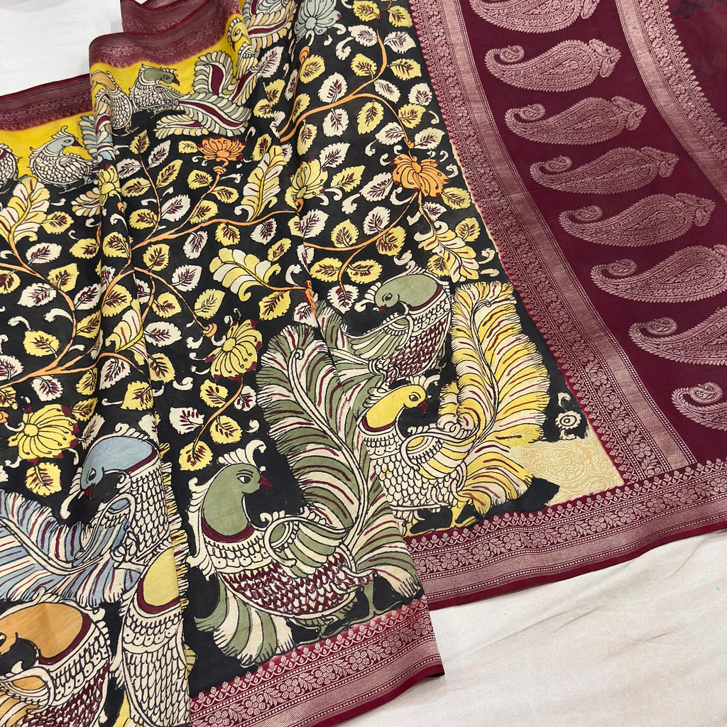 An authentic Srikalahasti hand drawn and hand painted kalamkari saree with 100% organic dye on pure katan silk banarasi saree. This saree has floral body while the border is adorned with annapakshi motifs.