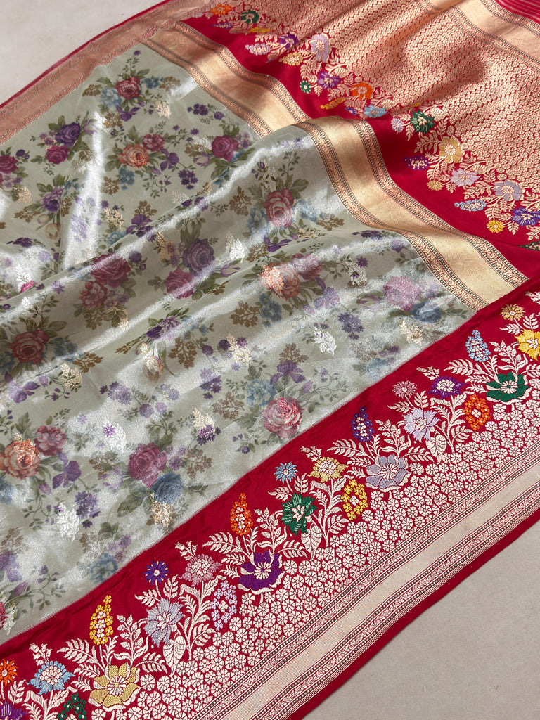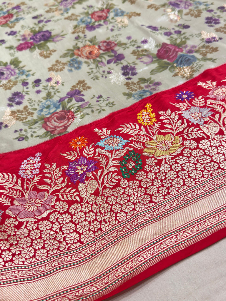 Pure tissue silk Handwoven fully kadwa all over silver and gold zari booties on multicolor designer flower Digital print base with gold zari and multicolour resham meenakari,kadhiyal contrast red border and designer pallu weave very much exclusive piece of Banarasi saree