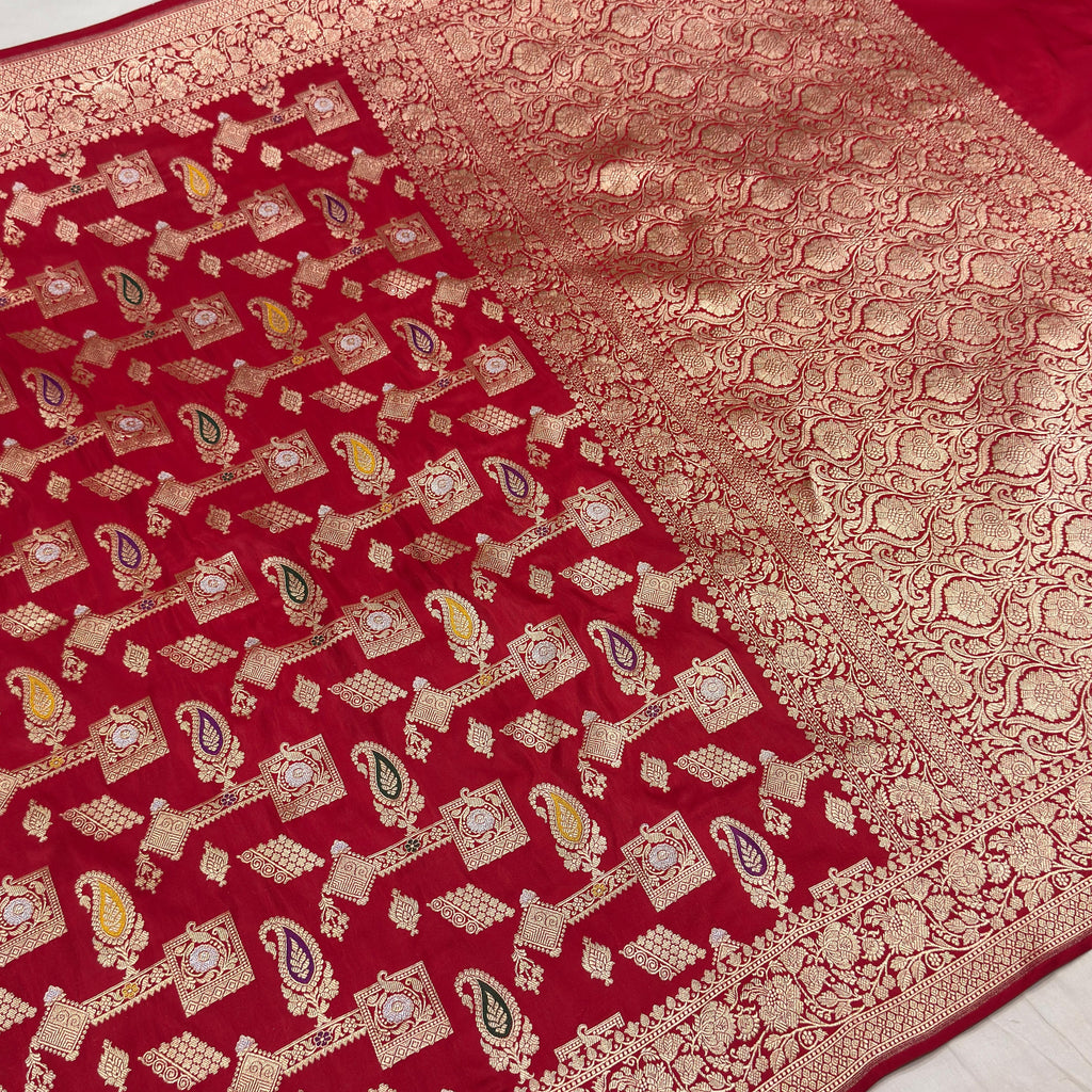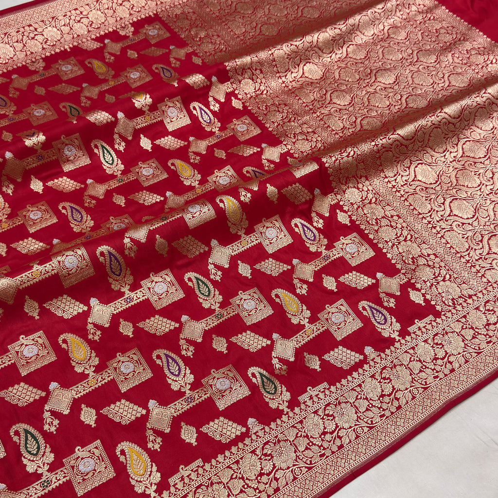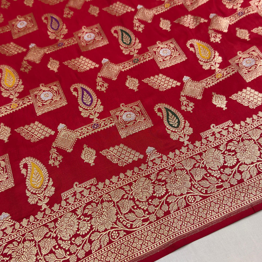 Pure mashru silk Handwoven all over gold zari geometricall and multicolour resham meenakari paisley motifs with gold zari rich border and pallu weave very much exclusive piece of Banarasi saree